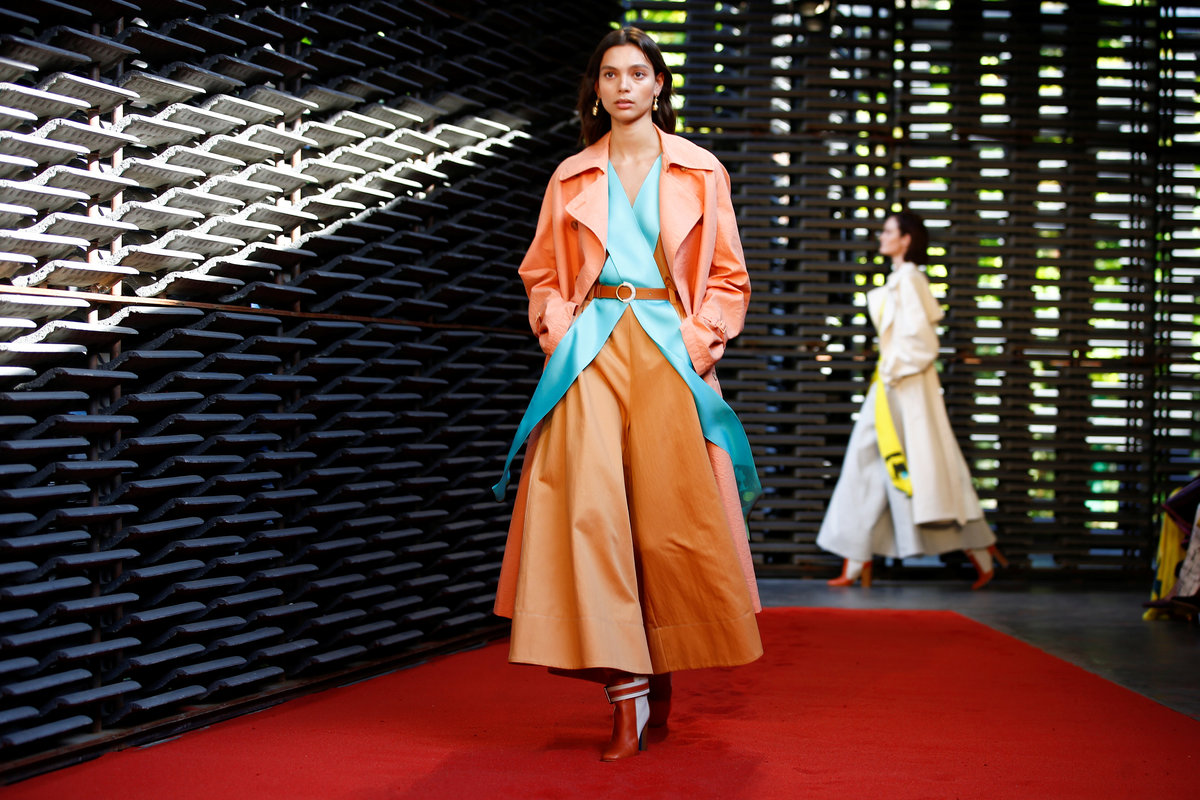 Models wore trench coats and smock dresses while long bright scarves added pops of color to trousers suits.