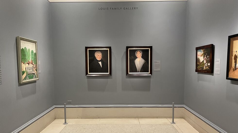 “Folk Art and Belonging” announces a sign. The text explains that folk art — also called “vernacular art” — is a wide range of creative endeavors, from handmade jugs to embroidered samplers to amateur portraiture.