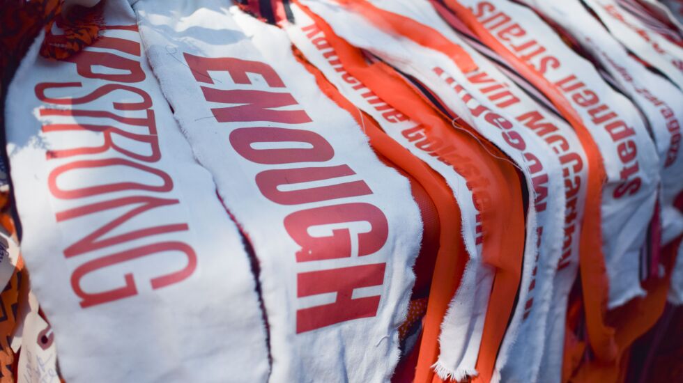 “Enough” consists of 30,000 strips of fabric to represent each child killed since the Sandy Hook massacre with messages of support from people around the country.