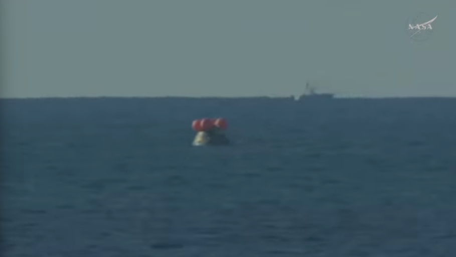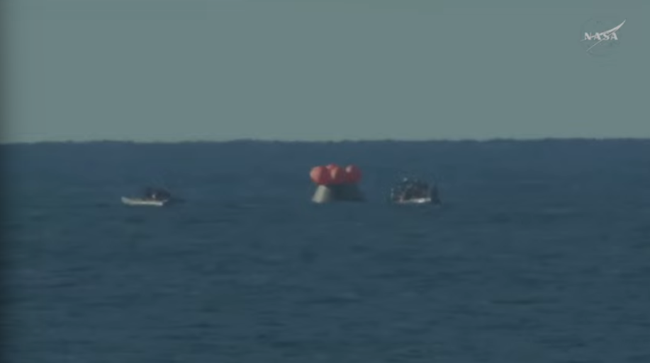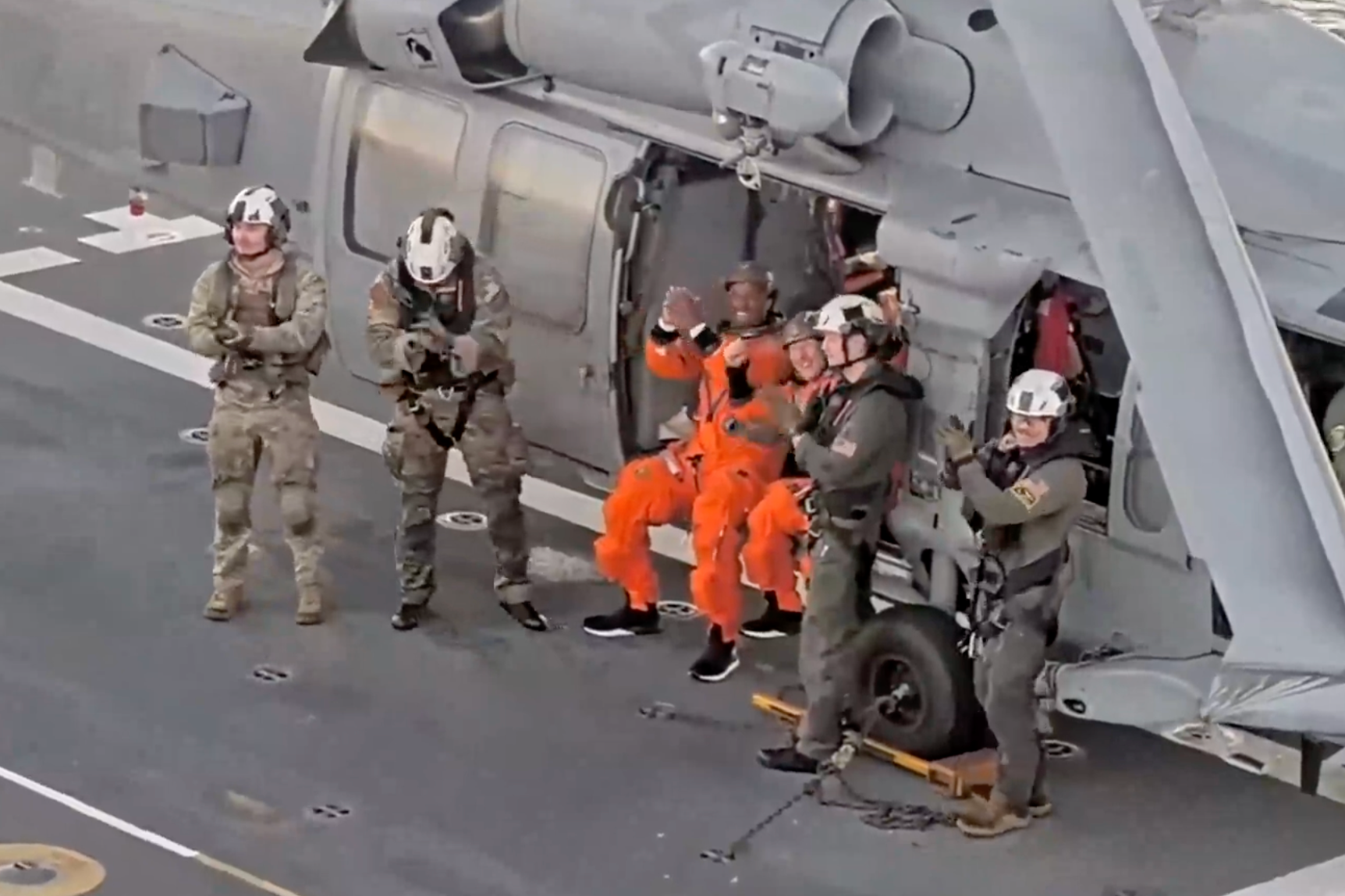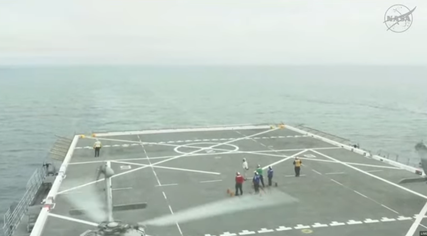 The crew landed in the waters off San Diego, California, before being retrieved from their spacecraft by Navy divers and transferred by helicopters to the recovery ship USS John P. Murtha.