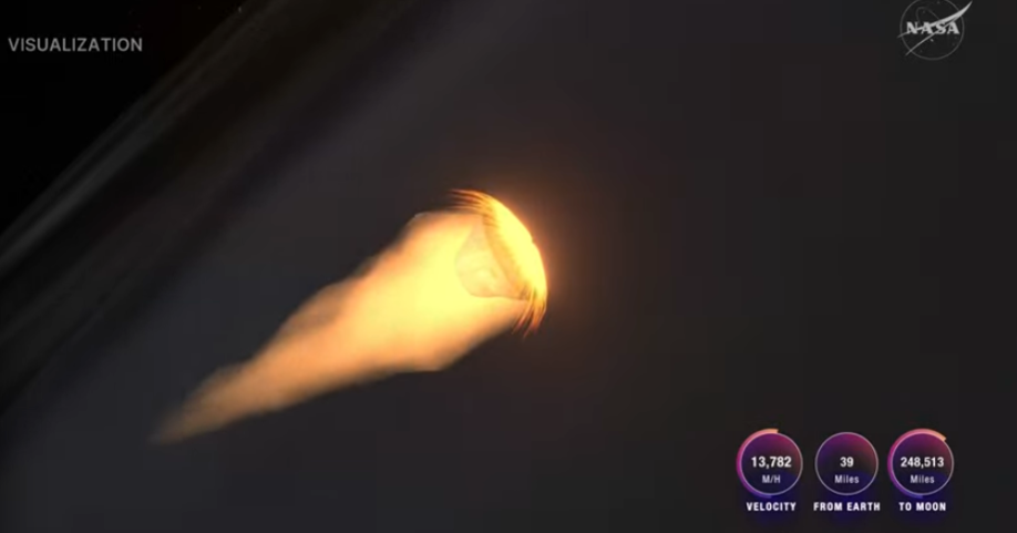 • 7:53 p.m.: When Orion reaches 400,000 feet above Earth’s surface while traveling nearly 35 times the speed of sound. The crew is expected to experience up to 3.9 Gs in the planned entry profile. This moment marks the spacecraft’s first contact with the upper atmosphere and the start of a planned six-minute communications blackout as plasma builds around the capsule.