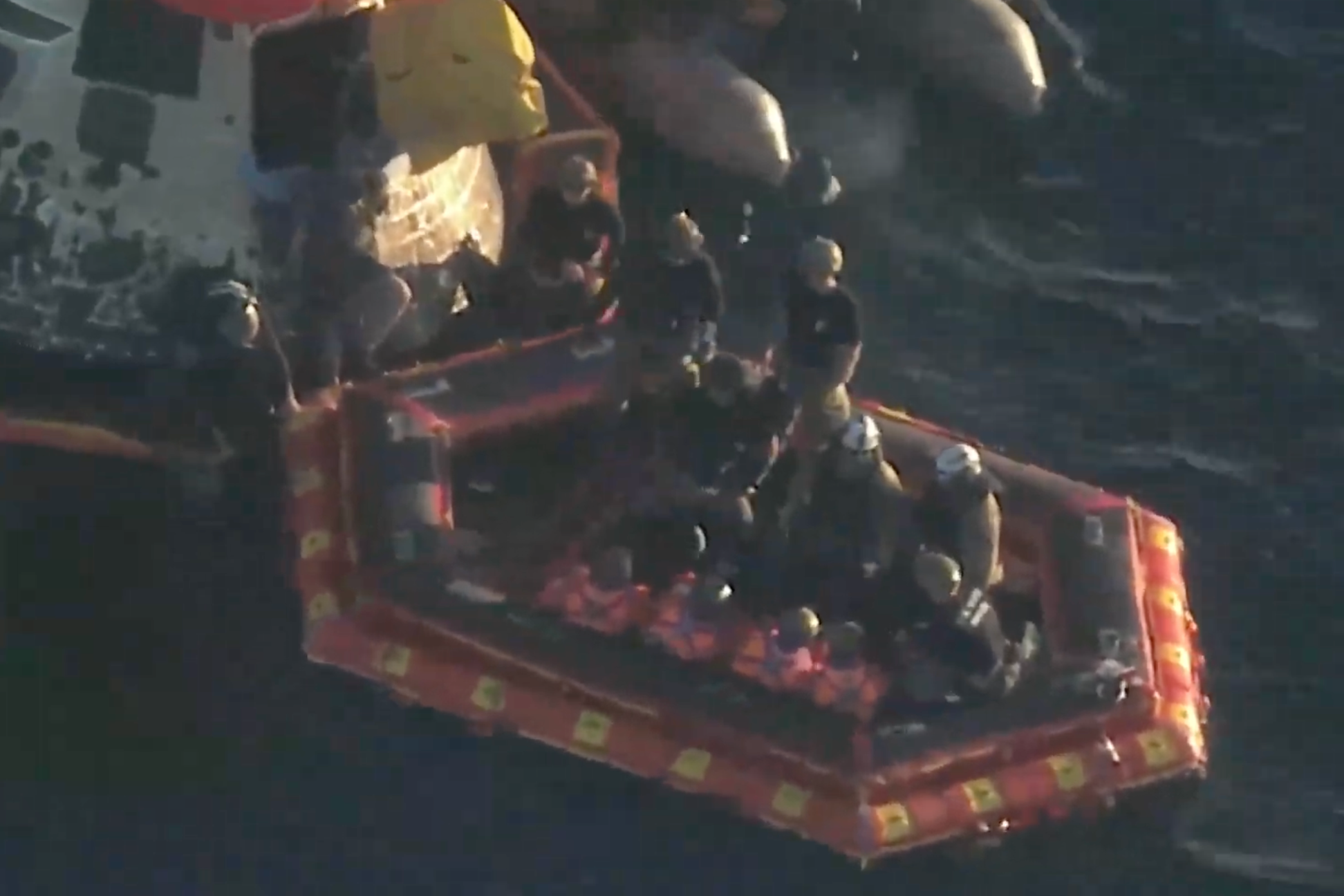 Artemis II commander Reid Wiseman (of NASA) and mission specialist Jeremy Hansen (of the Canadian Space Agency talk with NASA Flight Surgeon Richard Scheuring after being airlifted from their crew capsule by a U.S. Navy MH-60 Seahawk (Bill Ingalls/NASA/AFP Photo via Getty Images)