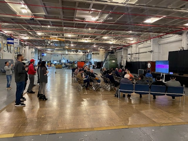 Guests watch the Artemis II mission at the USS Hornet Museum on Friday April 10, 2027 (Russell Moore / USS Hornet Museum)