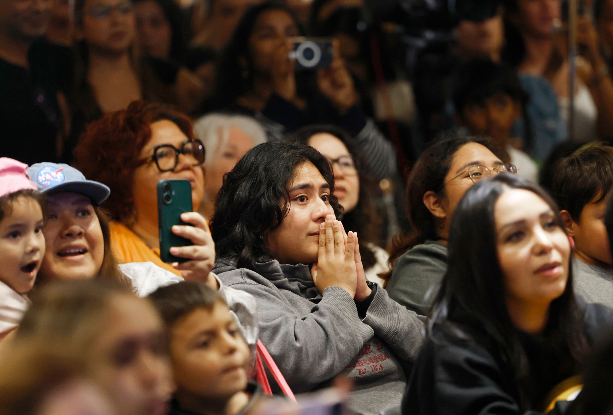 People watch a live broadcast before splashdown during an Artemis II splashdown party at the Columbia Memorial Space Center on April 10, 2026 in Downey, California (Mario Tama/Getty Images)