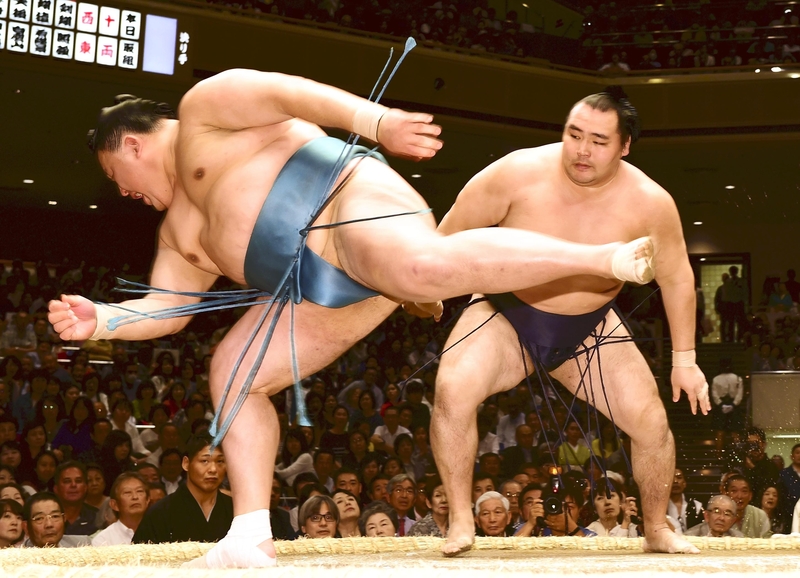 Yokozuna Kakuryu, right, dodges the charge of No. 1 maegashira Tamawashi (0-2), easily securing his second win in the Summer Grand Sumo Tournament at Tokyo's Ryogoku Kokugikan on Monday. In other action, yokozuna Hakuho was pushed to the edge of the ring before managing to throw down komusubi Mitakeumi (1-1) to also improve to 2-0. (The Japan News)