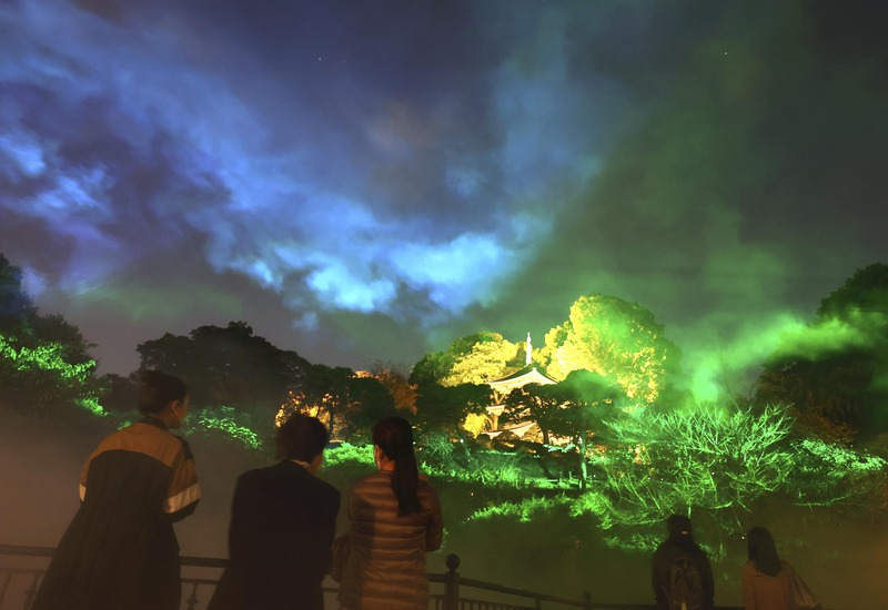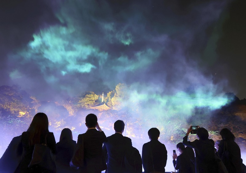 A dazzling aurora appeared Friday night over the garden of Hotel Chinzanso in Bunkyo Ward, Tokyo. According to the hotel, the aurora effect was created by projecting a spectrum of light onto artificial fog from various directions. Gazing up from the edge of the pond to enjoy the greenish-blue sky, onlookers could feel as if they had been transported to the arctic. The aurora show is scheduled to run until Feb. 7 next year, in about 5-minute performances to be held after sunset.