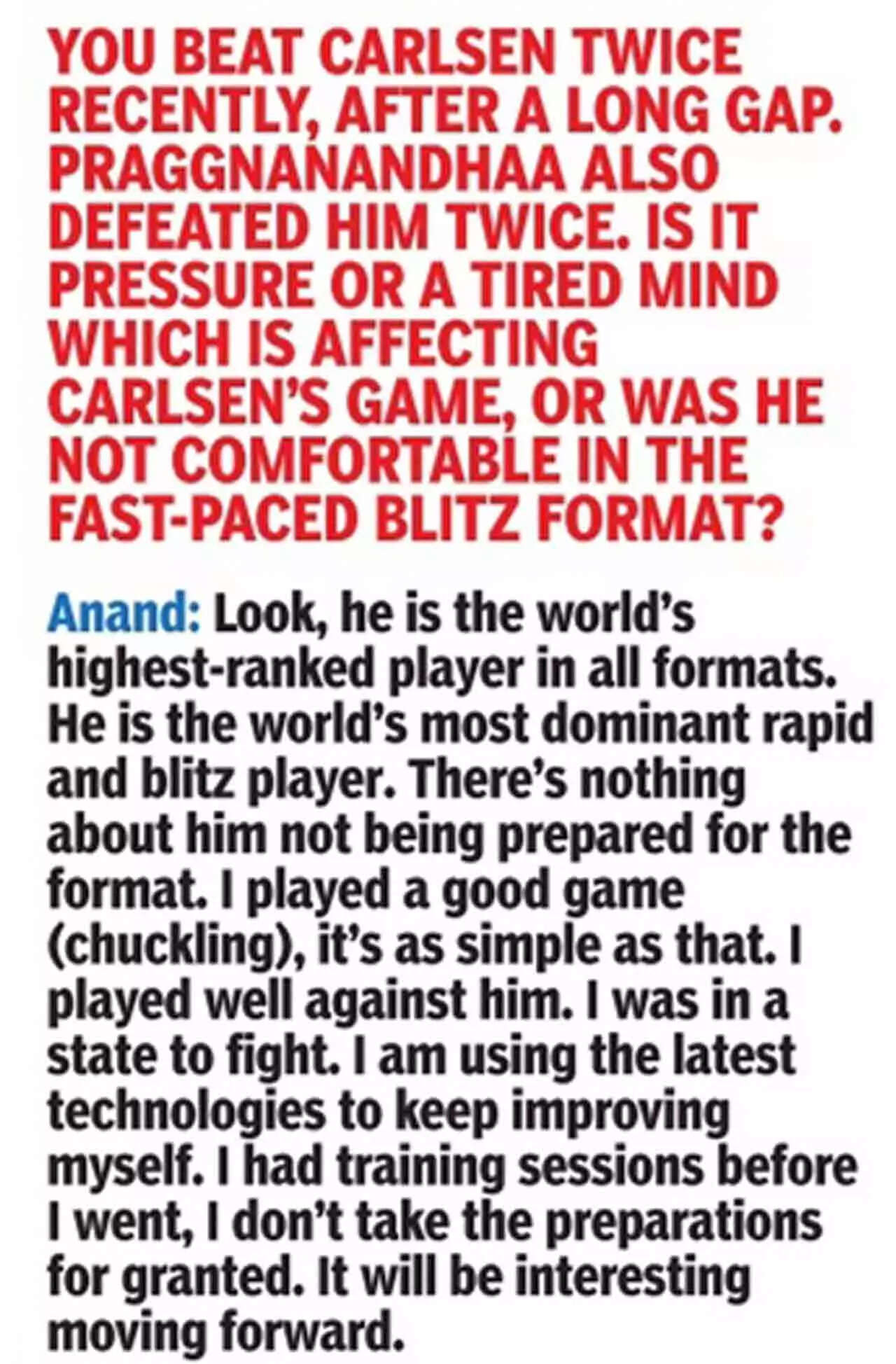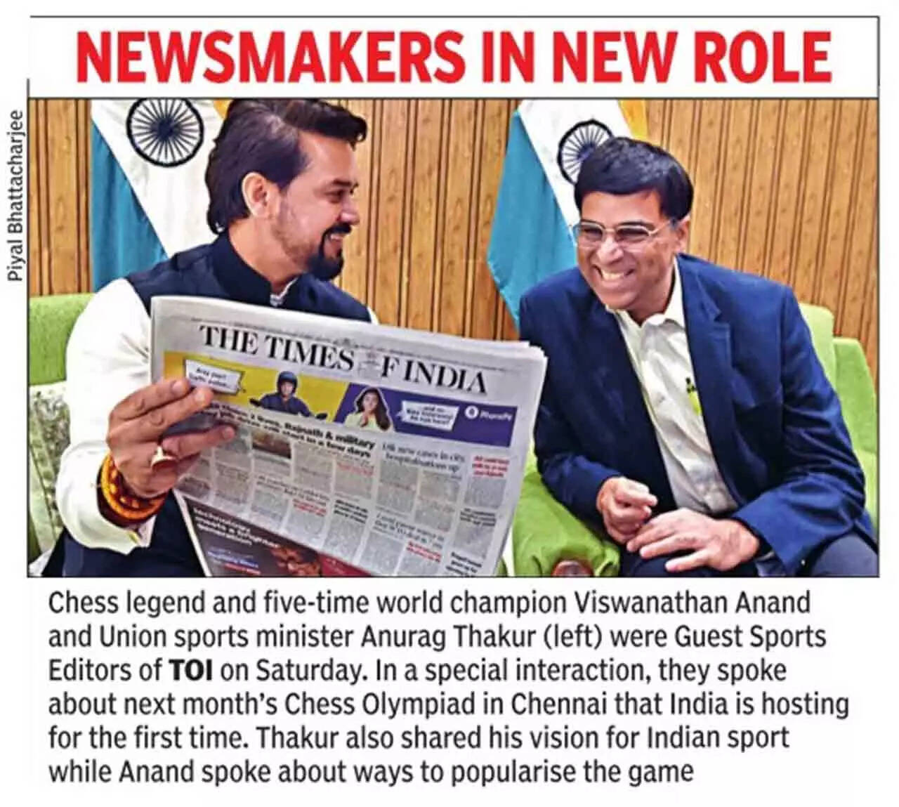 Anand, looking relaxed in a light summer coat, joined sports minister Anurag Thakur during an interaction with TOI in the Capital on Saturday. The two Guest Sports Editors talked about the way ahead for chess, plans to popularise the sport at the grassroots level and stage more international tournaments to give aspiring youngsters exposure to top-quality chess.