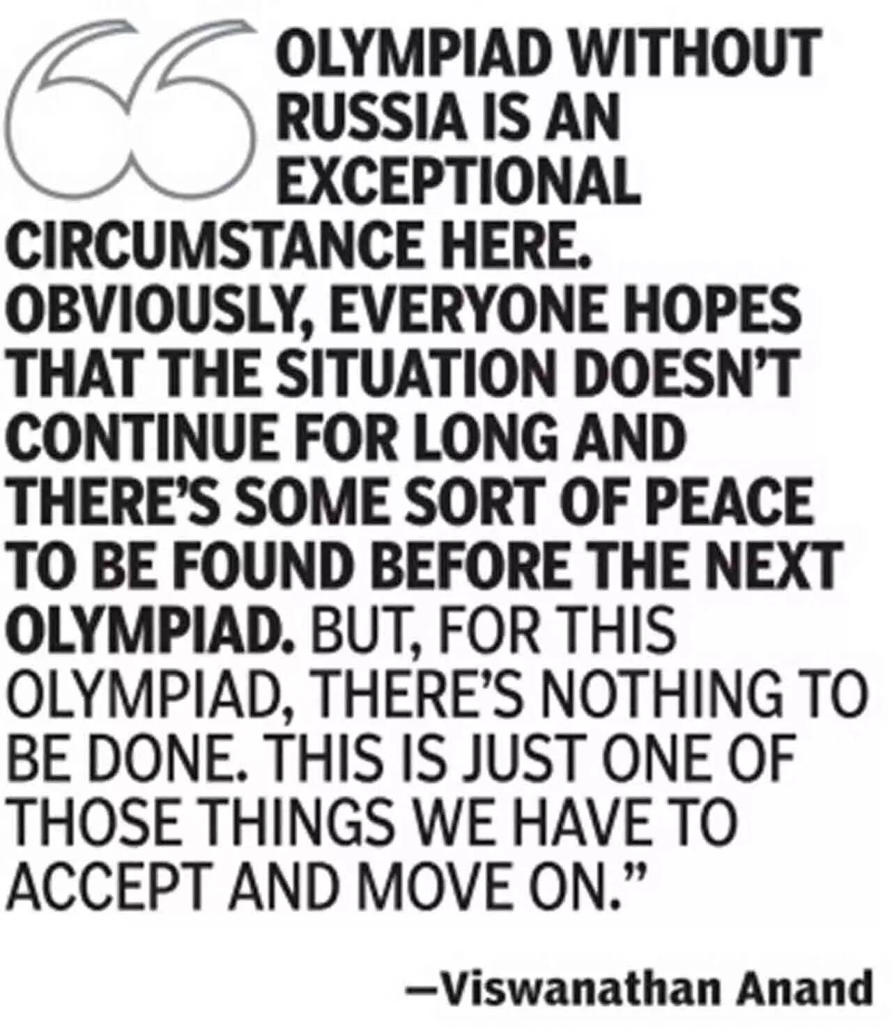 Anand: Well, this is an exceptional circumstance here. Obviously, everyone hopes that the situation doesn't continue for long and there's some sort of peace to be found before the next Olympiad. But, for this Olympiad, there's nothing to be done. This is just one of those things we have to accept and move on. Even without Brazil, you can have a good World Cup. But, we should also appreciate the fact that India has been able to host the Olympiad in three months. It's a miracle.