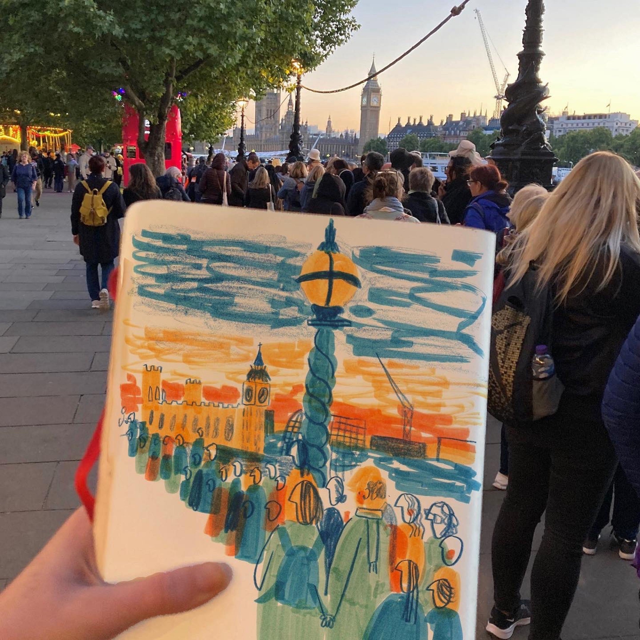 A freelance illustrator who was struck by the “impressive yet mundane sight” of the queue to see the Queen’s coffin has captured it on paper.