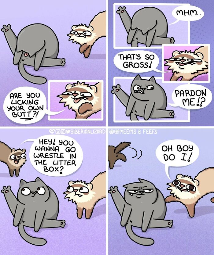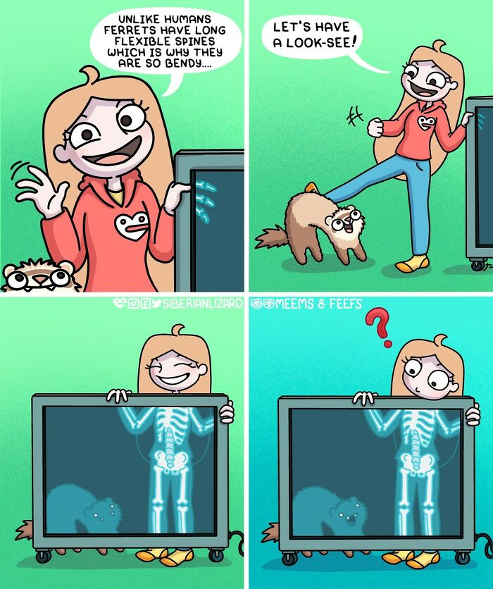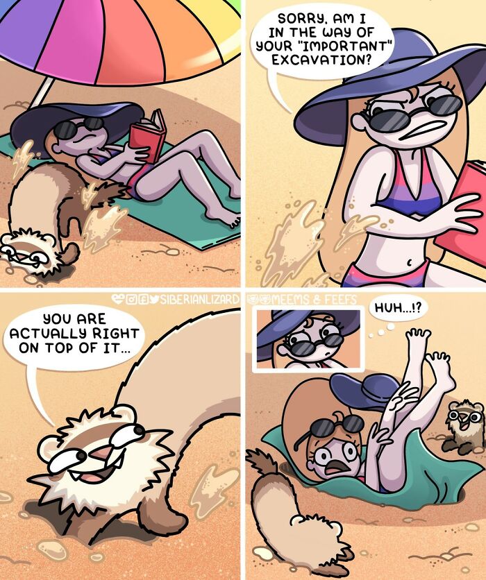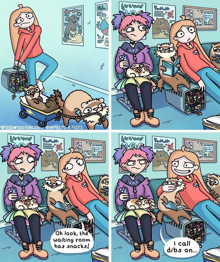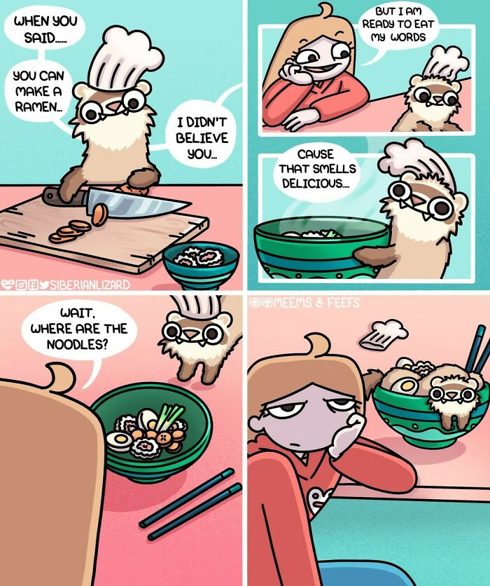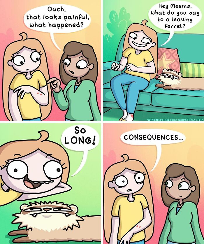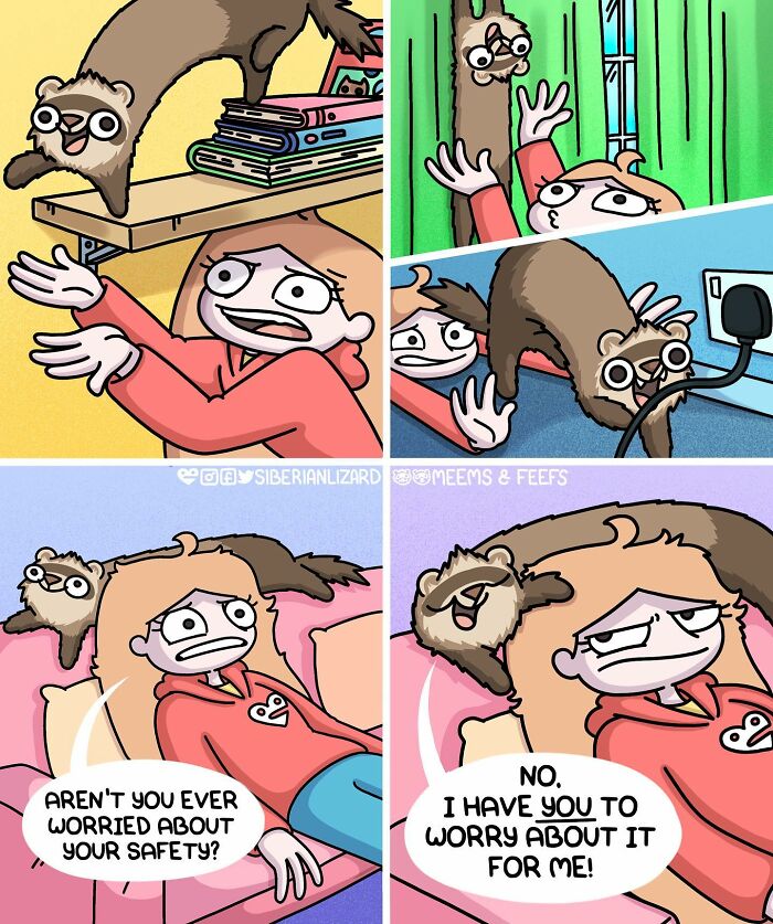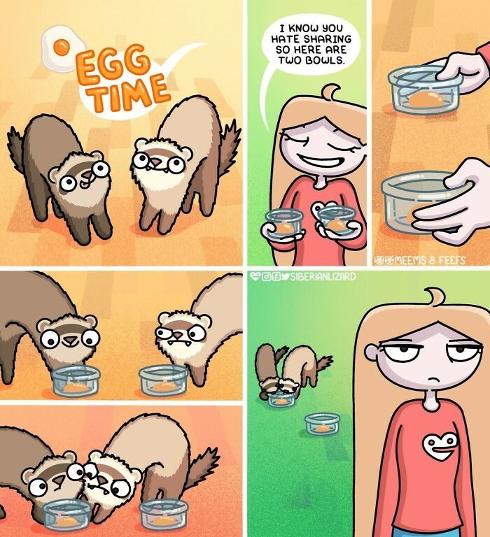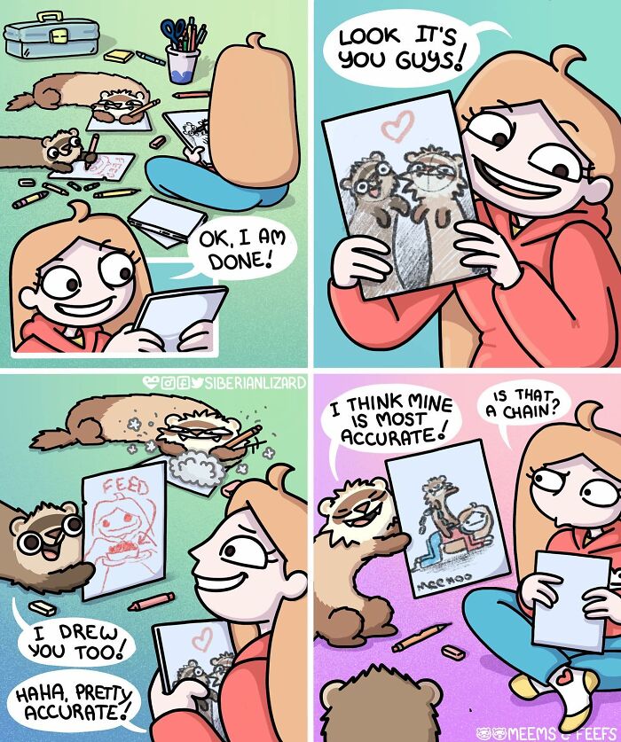 Siberian artist Liza Nechaeva captures the whimsically wholesome (and sometimes not) antics of her two ferrets, Meemoo and Feefo, through her humorous and engaging comics.