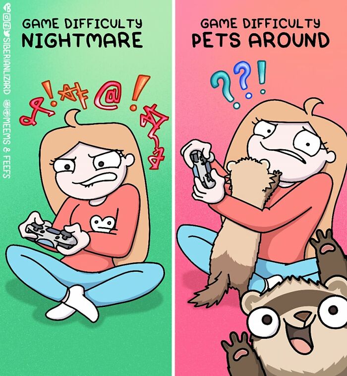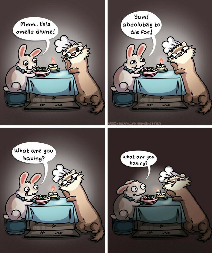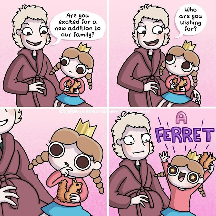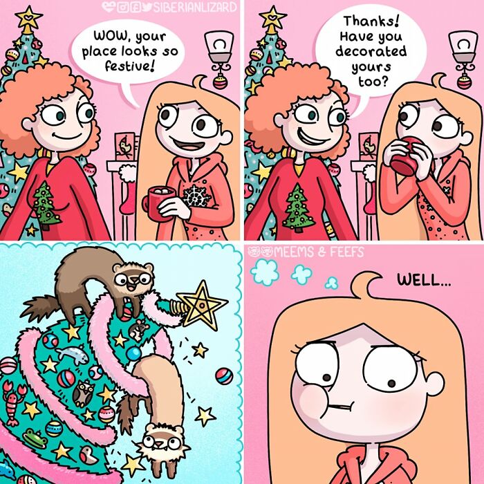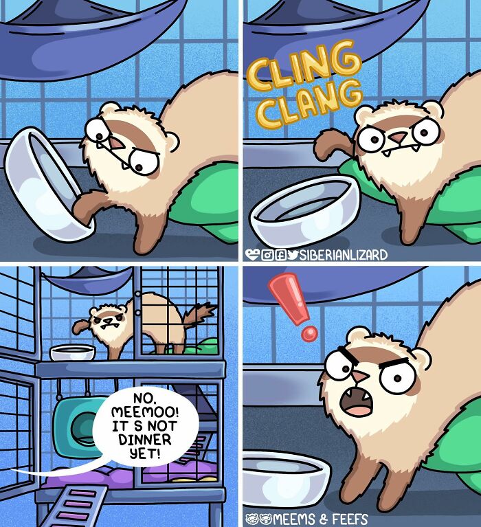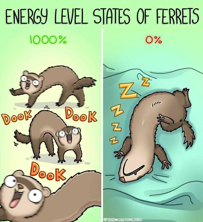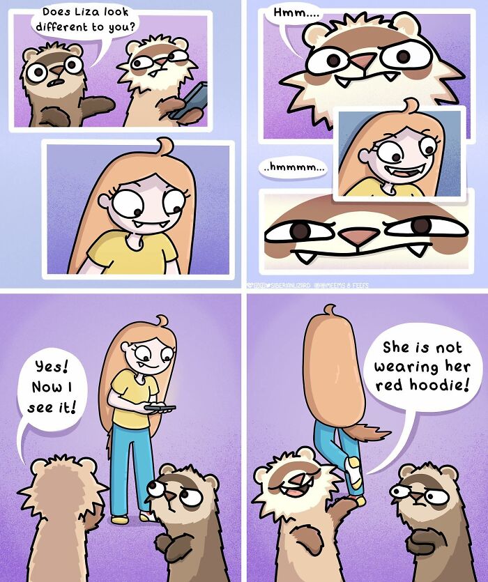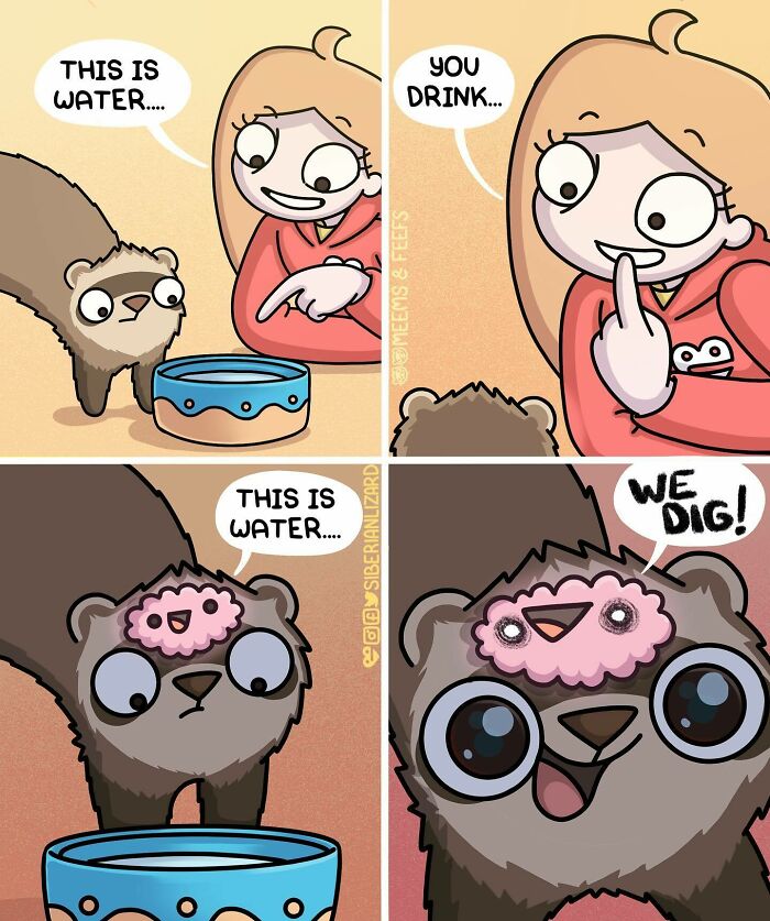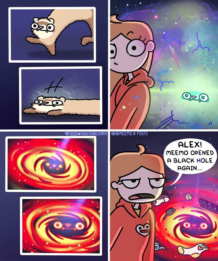 Siberian artist Liza Nechaeva captures the whimsically wholesome (and sometimes not) antics of her two ferrets, Meemoo and Feefo, through her humorous and engaging comics.