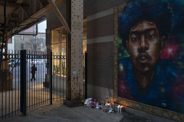 CHICAGO — A golden frame filled with the cosmos went up on a brick building near the Western Blue Line. Its creator, speckled in paint, finished off glints of light on the stars. In a few clean lines, he wrote, "memorial mural in progress."