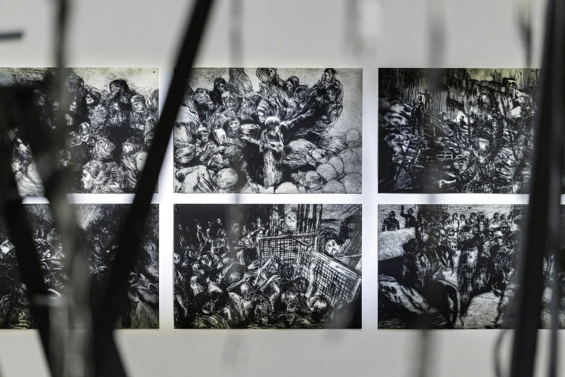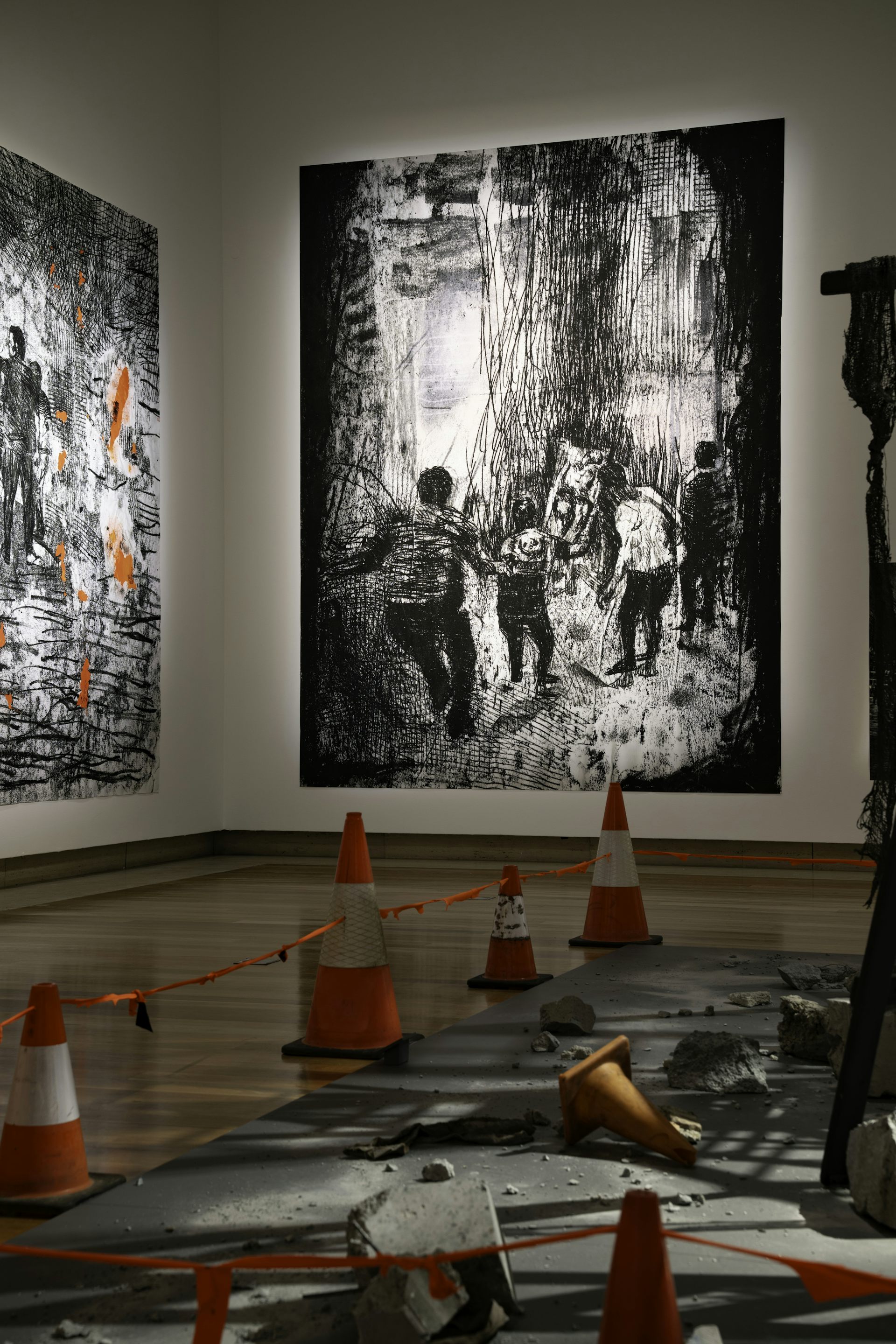 In the centre of the space, wreckage crashes through the ceiling with ladders stretching to the floor. The girth of the rubble-strewn central installation pushes viewers up close to the works inspired by artists like Goya, Picasso and Kollwitz, who addressed the brutality of war in their own prints.