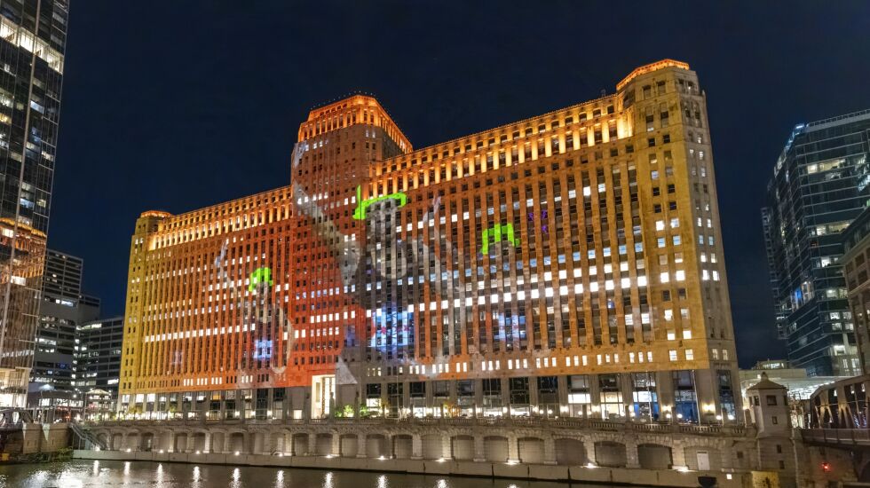 “Trap Moulin Rouge” can be viewed nightly at the Merchandise Mart, from the Chicago Riverwalk and along Wacker Drive between Orleans and Wells, through Nov. 18 as part of Art on theMart.