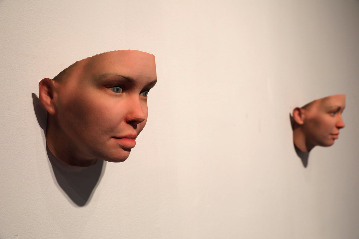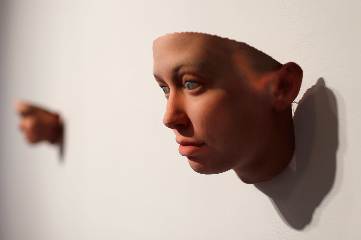 The exhibition by Dewey-Hagborg and Manning at the Fridman Gallery in Manhattan shows portraits of her with different color eyes or skin tone. Manning seems more masculine in some of the depictions, and in others more feminine in the show titled "A Becoming Resemblance."