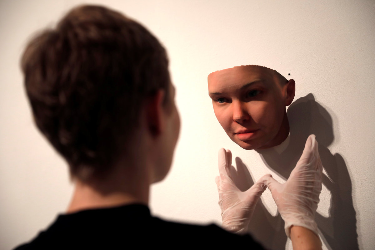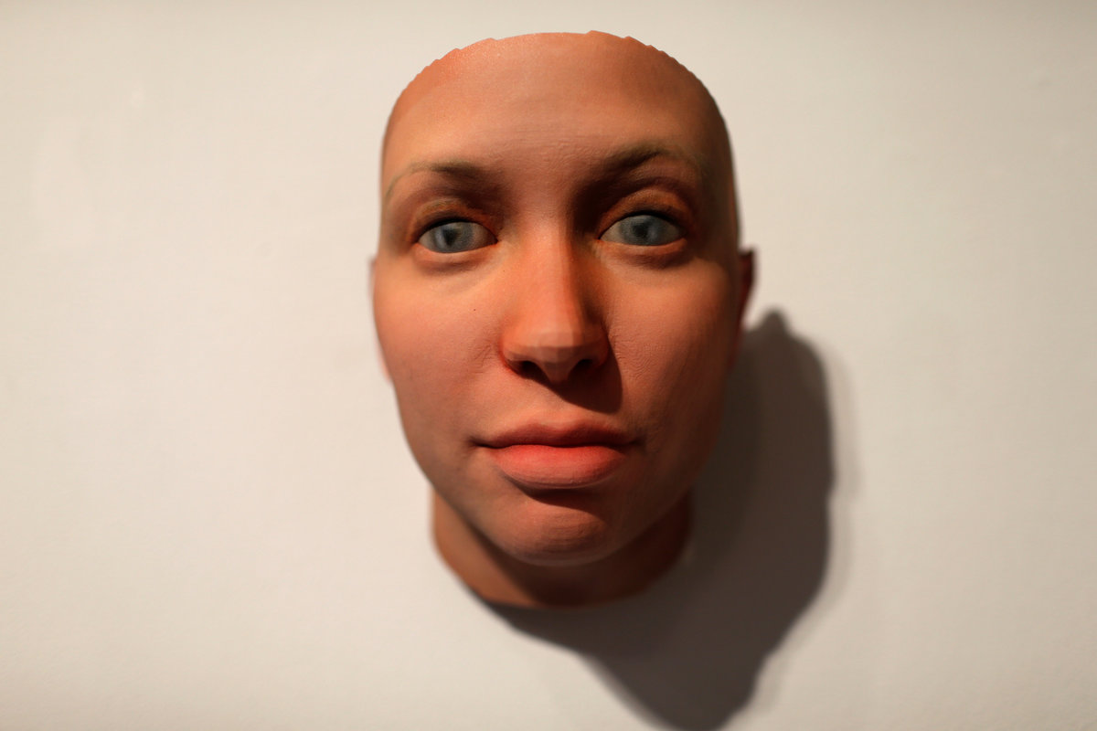 A 3-D printed mask created by Artist Heather Dewey-Hagborg from DNA extracted from cheek swabs and hair clippings she received from formerly imprisoned U.S. Army Private Chelsea Manning while she was in jail, is pictured ahead of the August 2, 2017 opening of "A Becoming Resemblance", an exhibition at the Fridman gallery in New York City, July 7, 2017. REUTERS/Mike Segar