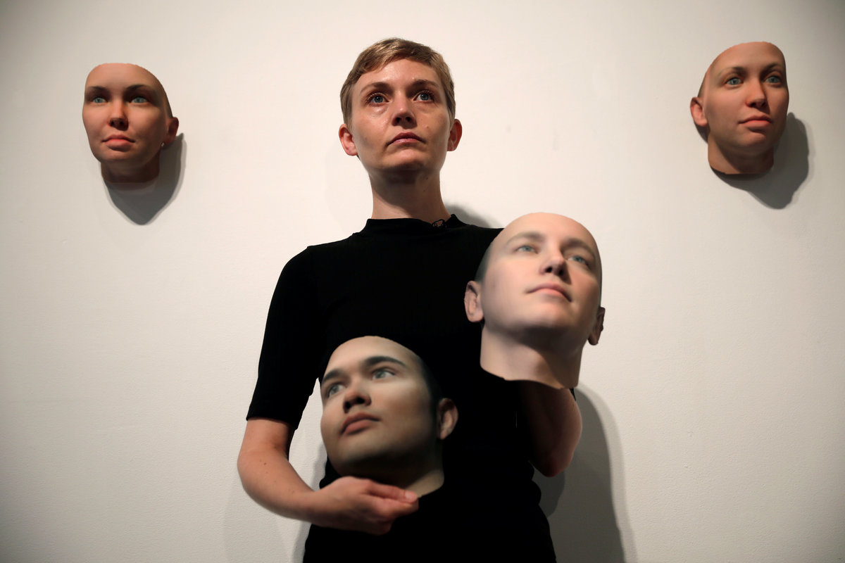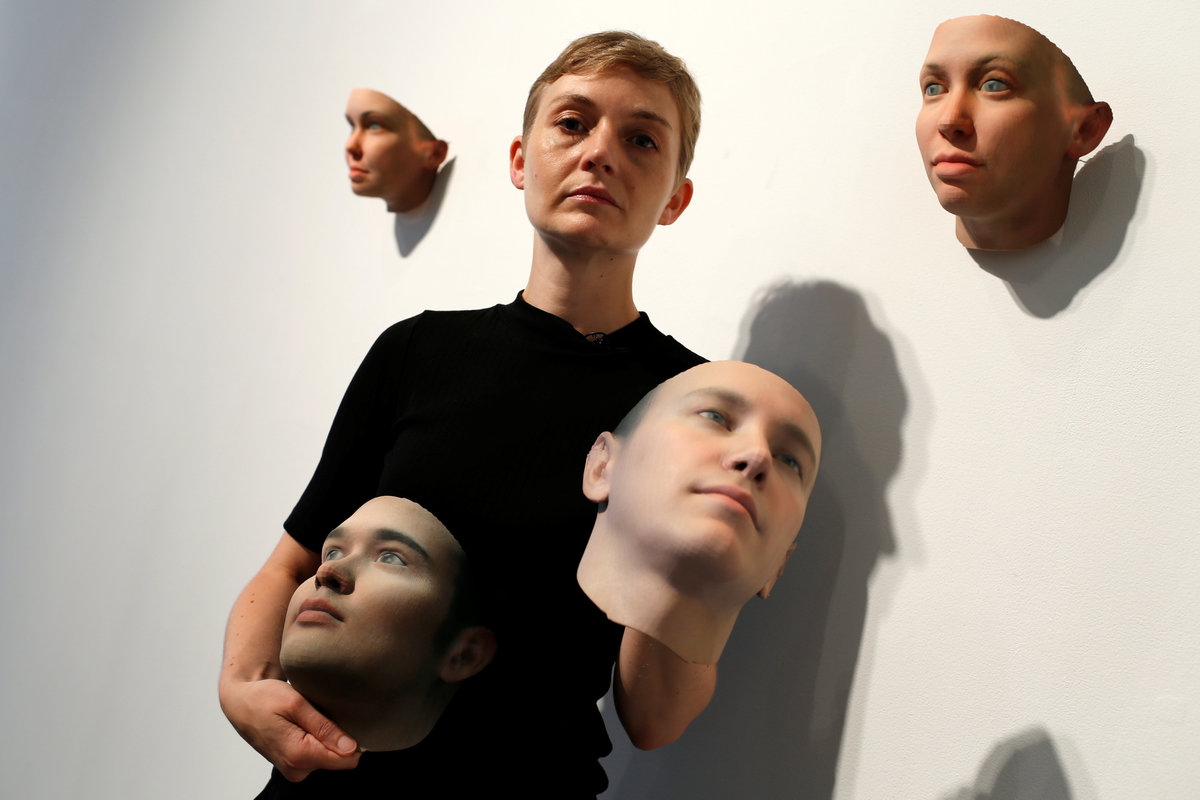 Artist Heather Dewey-Hagborg poses with 3-D printed masks created from DNA extracted from cheek swabs and hair clippings she received from formerly imprisoned U.S. Army Private Chelsea Manning while she was in jail, ahead of the August 2, 2017 opening of "A Becoming Resemblance", an exhibition at the Fridman gallery in New York City, July 7, 2017. REUTERS/Mike Segar