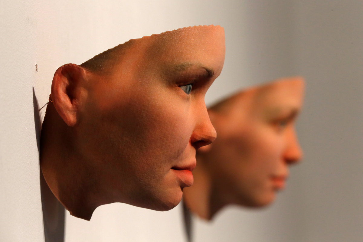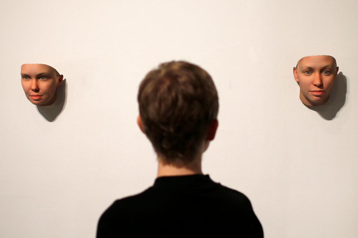3-D printed masks created by Artist Heather Dewey-Hagborg from DNA extracted from cheek swabs and hair clippings she received from formerly imprisoned U.S. Army Private Chelsea Manning while she was in jail, are seen ahead of the August 2, 2017 opening of "A Becoming Resemblance", an exhibition at the Fridman gallery in New York City, July 7, 2017. REUTERS/Mike Segar