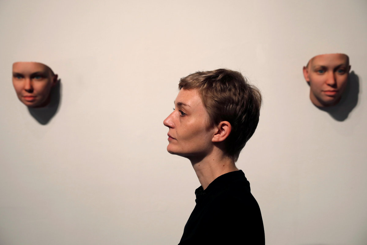 Artist Heather Dewey-Hagborg looks at 3-D printed masks she created from DNA extracted from cheek swabs and hair clippings she received from formerly imprisoned U.S. Army Private Chelsea Manning while she was in jail, ahead of the August 2, 2017 opening of "A Becoming Resemblance", an exhibition at the Fridman gallery in New York City, July 7, 2017. REUTERS/Mike Segar