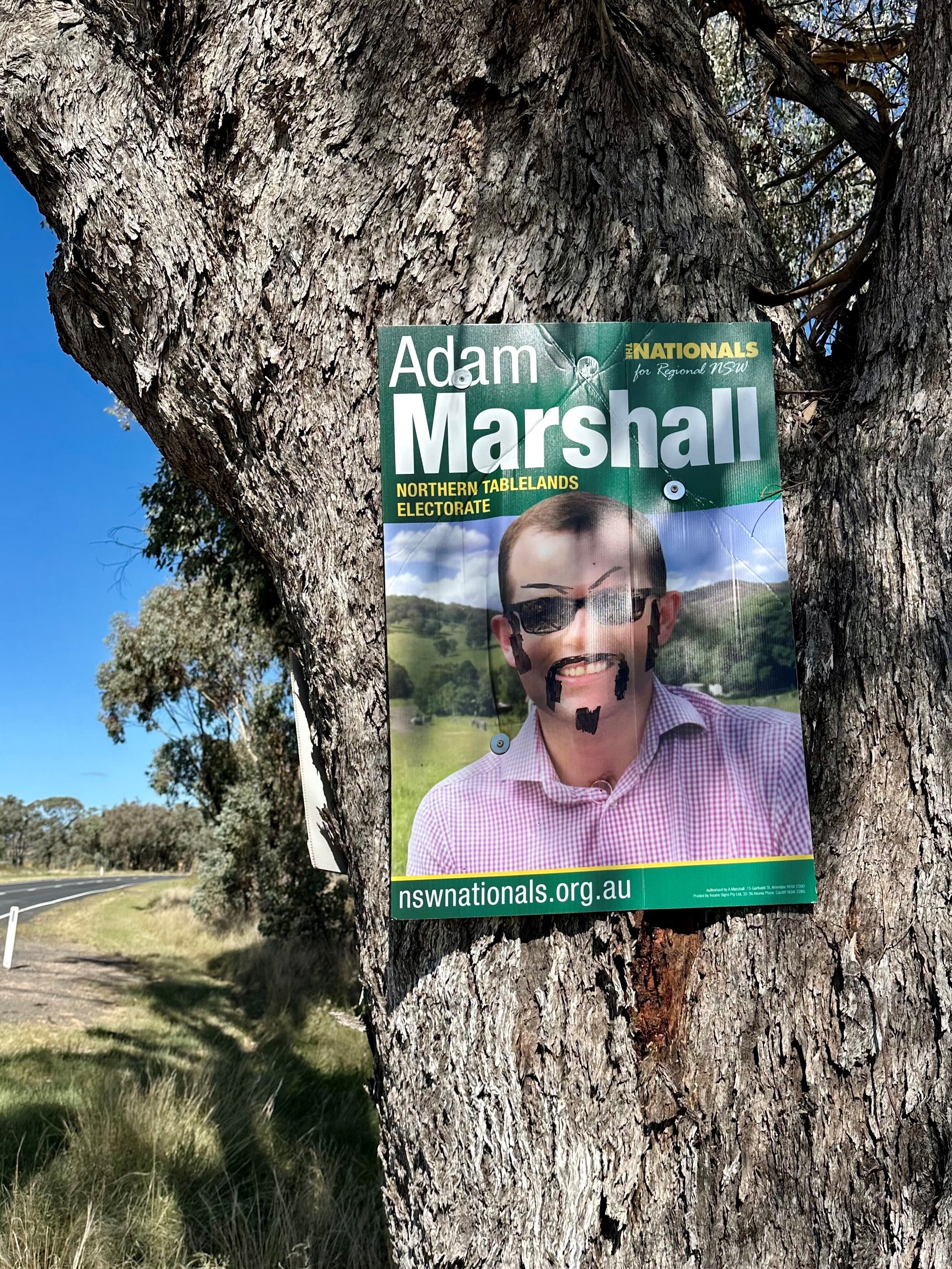 The NSW member for Northern Tablelands, Adam Marshall, was taking down corflute placards near Delungra when he came across three particular signs.