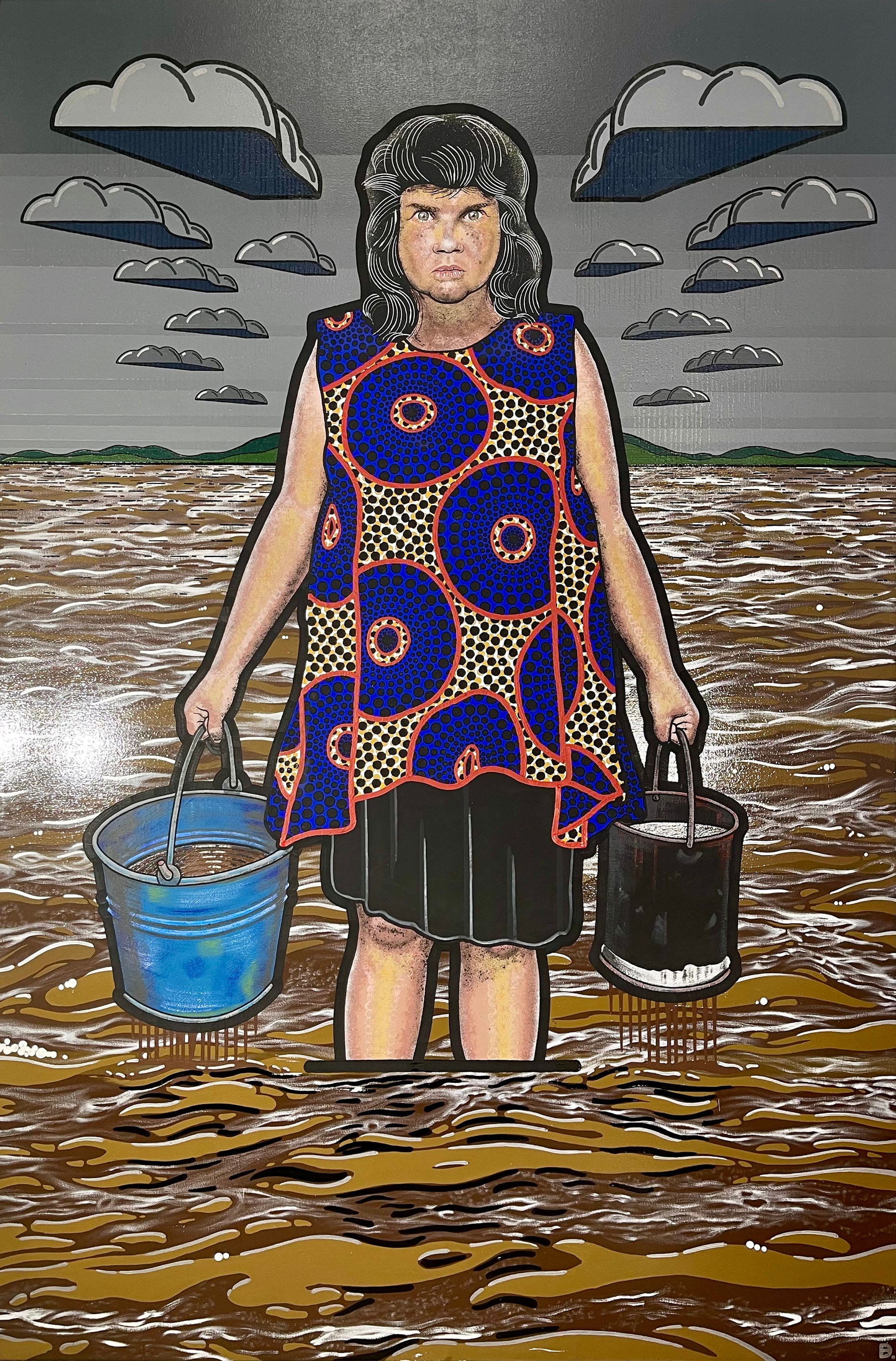 The painting, titled Moby Dickens, is Dhungutti artist Blak Douglas's entry into the Archibald Prize. It depicts Dickens, a Lismore-based Wiradjuri artist, standing in floodwaters, holding a leaking pail of water in each hand.