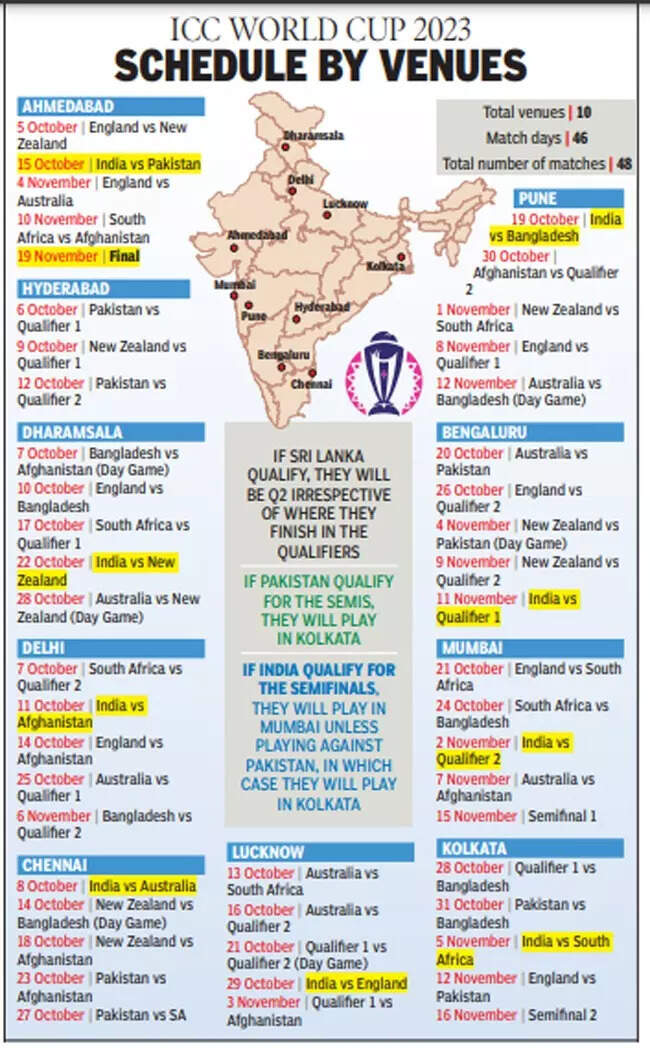 Delhi's Arun Jaitley Stadium will host its opening game on October 7, featuring South Africa and a Qualifier. The biggest clash at the venue will be on October 11 when India take on Afghanistan. Additionally, Afghanistan will face England on October 14. The remaining two league matches are scheduled for October 25 and November 6.