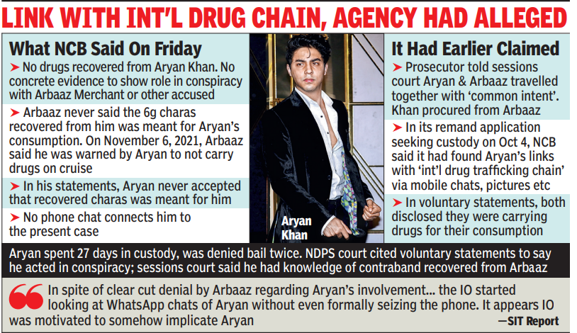 In its internal report, the SIT said: “It appeared that the investigating officer was somehow motivated to implicate Aryan Khan in the drug case”.