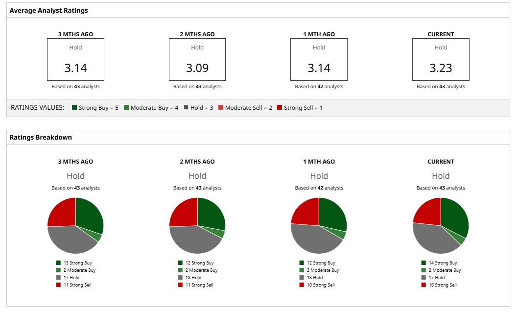 Analyst opinion is seemingly significantly divided when it comes to TSLA stock. Currently, 14 analysts believe that the stock is a “Strong Buy,” while 10 analysts opine that TSLA stock is a “Strong Sell.” However, a majority of them, 17 analysts, believe that the stock is a “Hold.”