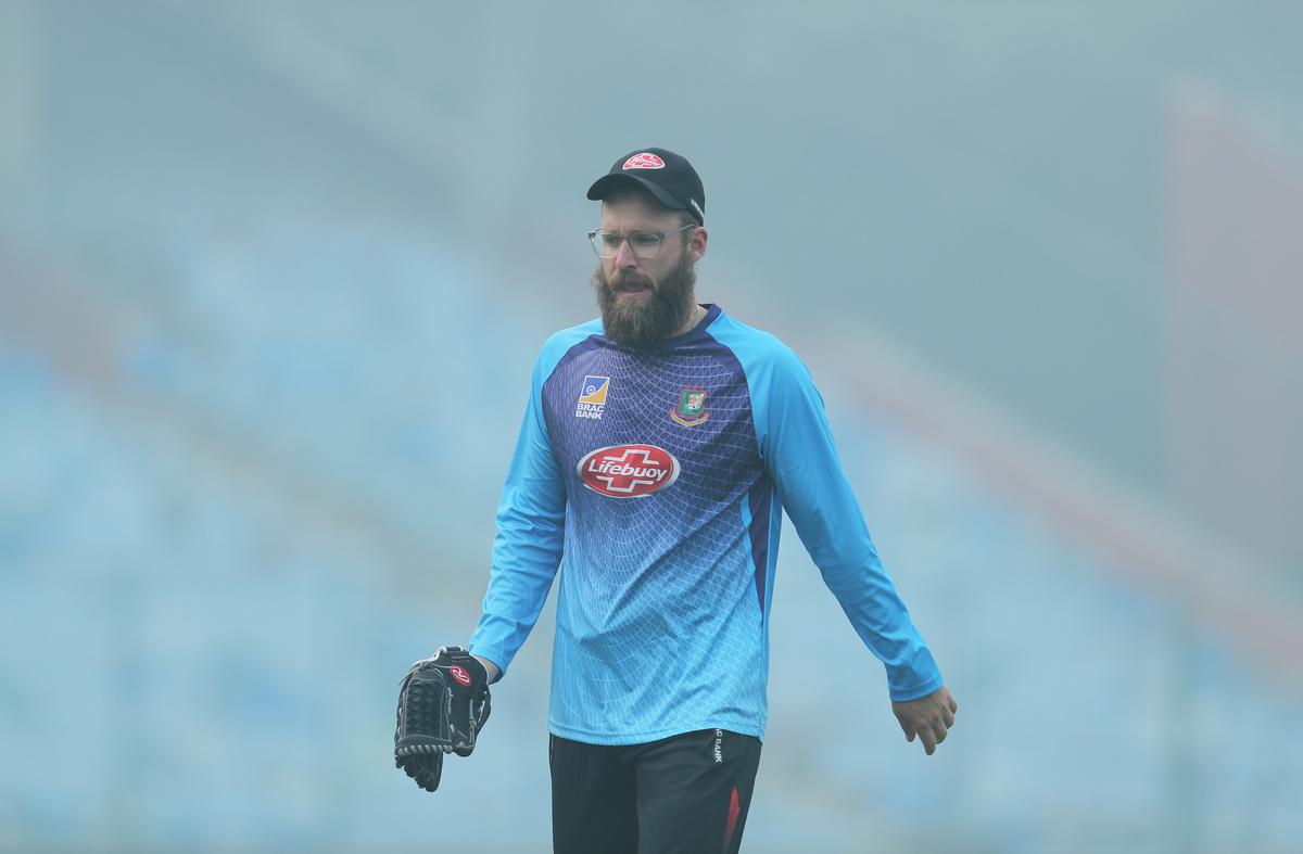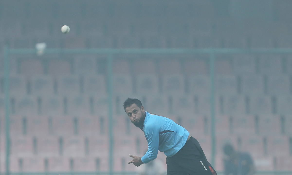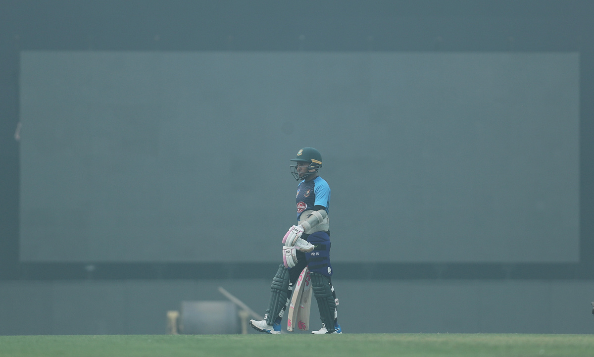 Bangladeshi cricketers spent more than two hours at the nets under the smoggy skies on Thursday. Liton Das, the only one wearing a mask, shrugged off concerns over air quality.