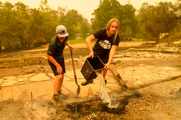 SANTA ROSA, Calif. _ In the hills above Highway 12, Emmilia Carrington hoisted a trash can full of water into her neighbor's backyard and tipped it over, turning smoldering ash into a rush of steam that curled up over her black rain boots.