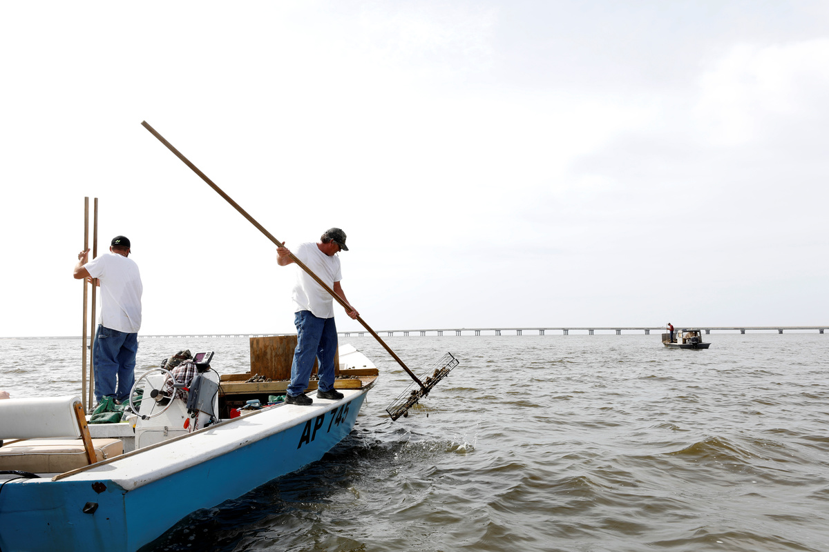 Standing in his boat in Florida's Apalachicola Bay, Michael Dasher lowered a long pair of tongs into the water, pulling up a muddy mass of oysters that his son sorted, keeping those big enough to sell and tossing the rest back into the brackish bay.