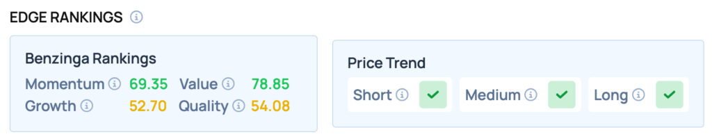 Ford scores well on the Momentum and Value metrics, while offering satisfactory Growth and Quality. Ford also offers a favorable price trend in the Short, Medium and Long term. For more such insights, sign up for Benzinga Edge Stock Rankings today!