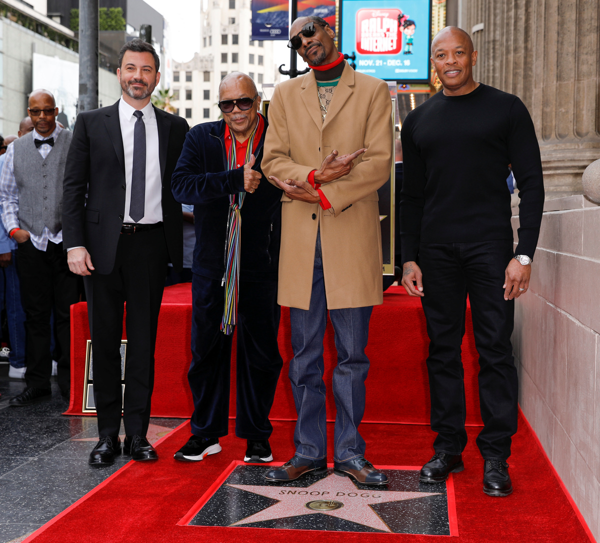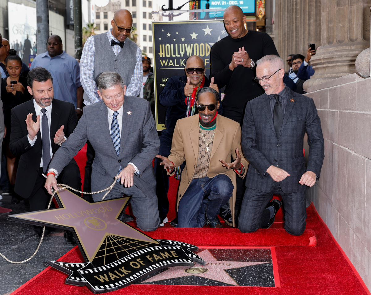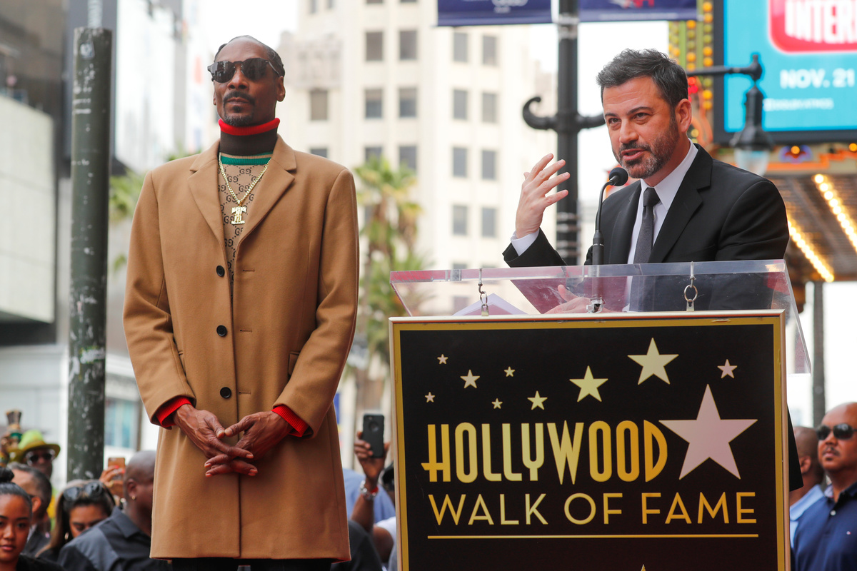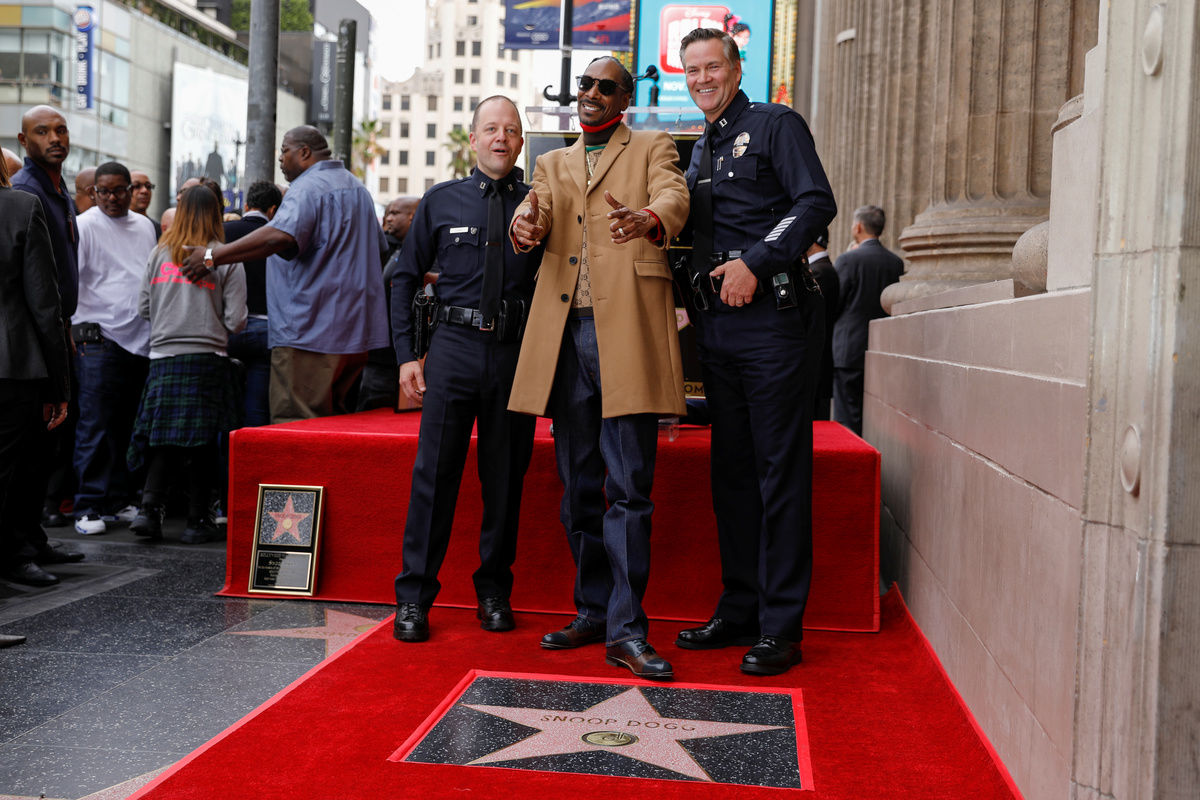 Rapper Snoop Dogg poses for a picture with his wife Shante Broadus after receiving his star on "Hollywood Walk of Fame" in Los Angeles, California, U.S., November 19, 2018. REUTERS/Mike BlakeRapper Snoop Dogg receives his star on the "Hollywood Walk of Fame" with Dr. Dre, Quincy Jones and Jimmy Kimmel in Los Angeles, California, U.S., November 19, 2018. REUTERS/Mike BlakeRapper Snoop Dogg receives his star on the "Hollywood Walk of Fame" in Los Angeles, California, U.S., November 19, 2018. REUTERS/Mike BlakeRapper Snoop Dogg receives his star on the "Hollywood Walk of Fame" with Dr. Dre, Quincy Jones and Jimmy Kimmel in Los Angeles, California, U.S., November 19, 2018. REUTERS/Mike BlakeRapper Snoop Dogg's star is seen on the "Hollywood Walk of Fame" in Los Angeles, California, U.S., November 19, 2018. REUTERS/Mike BlakeJimmy Kimmel introduces rapper Snoop Dogg as he receives his star on the "Hollywood Walk of Fame" in Los Angeles, California, U.S., November 19, 2018. REUTERS/Mike BlakeRapper Snoop Dogg poses with LAPD officers after receiving his star on the "Hollywood Walk of Fame" in Los Angeles, California, U.S., November 19, 2018. REUTERS/Mike Blake