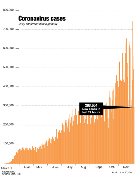 Among those hospitalized, 350 required intensive care, up from 344 Monday. ICU hospitalizations have more than doubled since the beginning of November, when they were at 127.