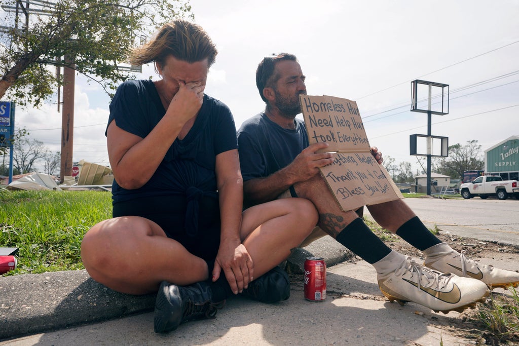 The couple has been staying at a shelter since the storm passed, but they don't know what will come next. Broke, they panhandled along a road, with a sign: "Hurricane took everything.”