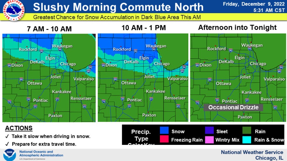 Generally, areas north of Interstate 80 will be snow while areas to the south will get rain, the weather service said. Most of the snow will fall between 8 a.m. and 1 p.m., it said.