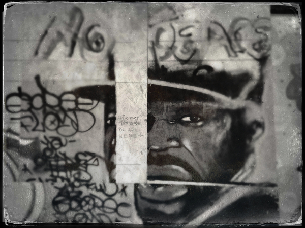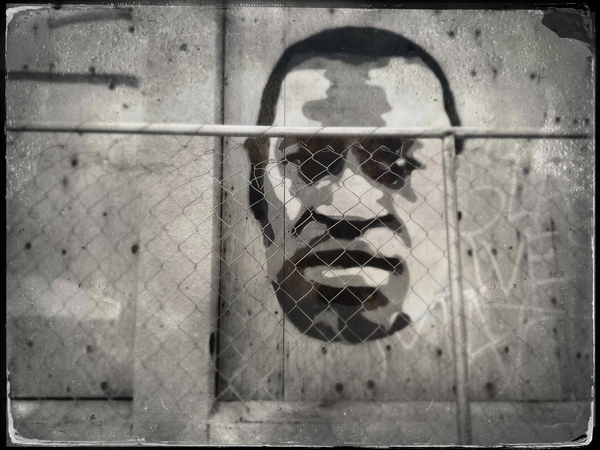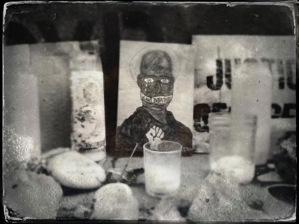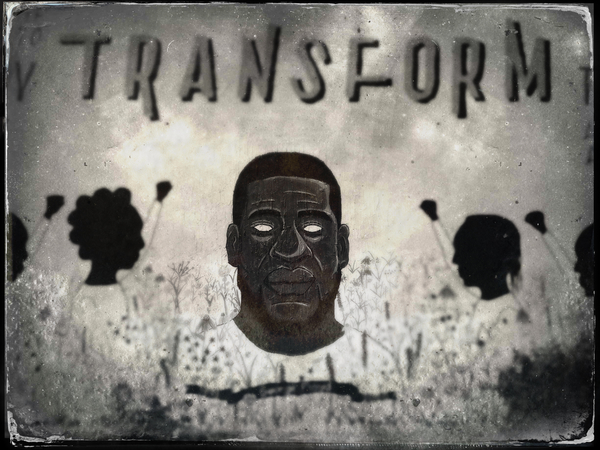 A drawing of George Floyd hung at the site of his death at the intersection of Chicago Avenue and East 38th Street in Minneapolis. (Anthony Souffle/Minneapolis Star Tribune/TNS)