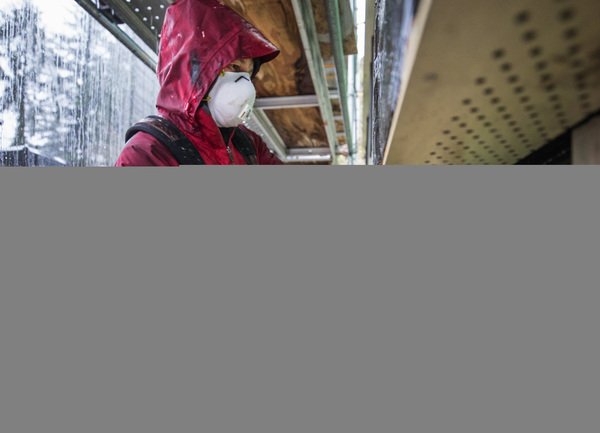 A NEST design+build construction worker with protective mask installs siding last week at a site in South Seattle. Residential construction has been allowed to proceed under the new COVID restrictions. (Steve Ringman/The Seattle Times/TNS)