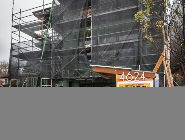 A NEST design+build construction site in South Seattle has signs that can be seen from the street and a wash station behind the sign for workers. (Steve Ringman/The Seattle Times/TNS)