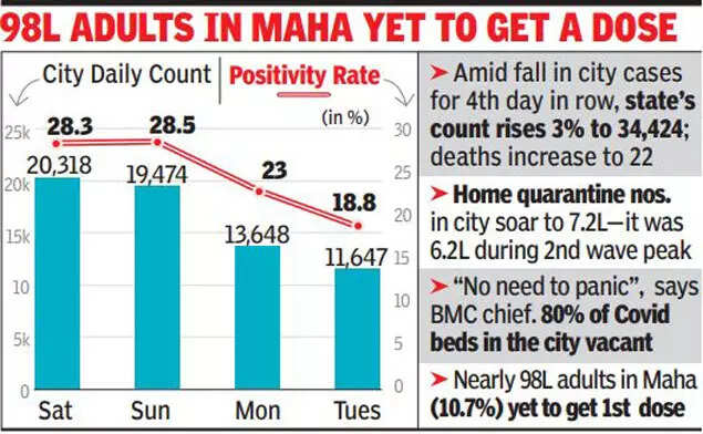 “The Omicron wave (in Mumbai) is flattening for sure,” said Dr Shashank Joshi, a member of the state government’s task force on Covid. As experts expect different peaks in various cities and regions, the Covid tally in Maharashtra registered a 3% rise over a 24-hour period: cases climbed to 34,424 on Tuesday as against 33,470 a day earlier. The reason for cheer in Mumbai stems not only from a dropping daily count, but also a drop in the daily positivity rate.
