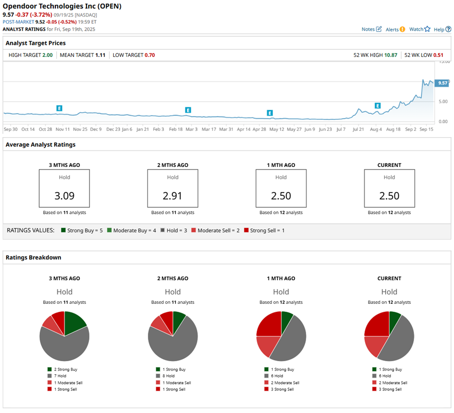 Analysts see Opendoor edging toward firmer ground. They anticipate fiscal 2025 losses to narrow 41.5% YOY to -$0.31 per share, with another 29% improvement foreseen in fiscal 2026 to $0.22 per share. It is not a profit story yet, but the trend suggests a slow and steady crawl toward financial stability.
