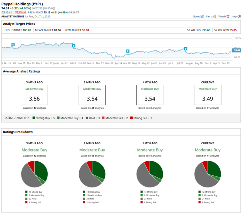 Wall Street remains moderately bullish on PYPL stock with an overall consensus “Moderate Buy” rating. Of the 41 analysts covering the stock, 12 advise a “Strong Buy,” two suggest a “Moderate Buy,” 23 analysts are on the sidelines with a “Hold” rating, and four rate it as a “Strong Sell.”