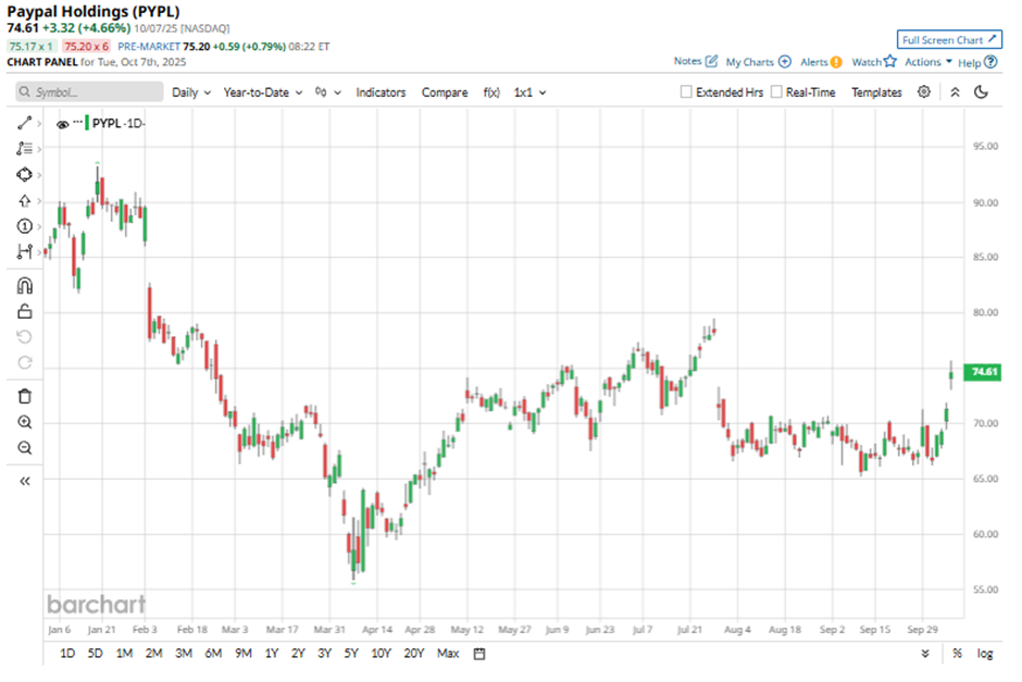 Over the past year, PYPL stock has endured a choppy ride, as it is down 17% despite occasional rebounds, reflecting investor skepticism amid broader tech volatility. On a year-to-date (YTD) basis, the stock is down 22%, weighed down by concerns over slowing growth and margin pressure. PYPL is also down 3% over the past month.