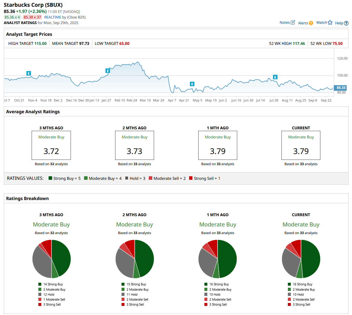 Presently, there is some mixed response from Wall Street on the coffee chain, with a consensus “Moderate Buy” rating and a mean price target of $97.73, reflecting an upside potential of 14% from the market rate.