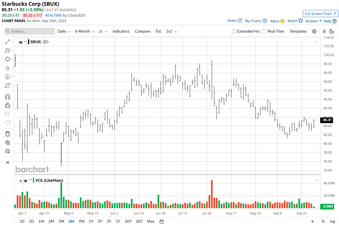 SBUX stock has declined 0.2% over the last five days and fallen 3.4% for the month. Over six months, it is down 13%, with a year-to-date (YTD) loss of 6.5% and a 52-week drop of roughly 13%.