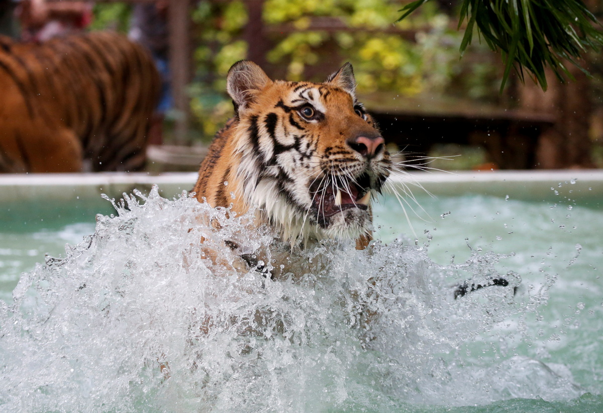 Tigers were fed frozen chicken 'popsicles' and enticed to splash in a wading pool at a Thai zoo on Thursday as temperatures rose.