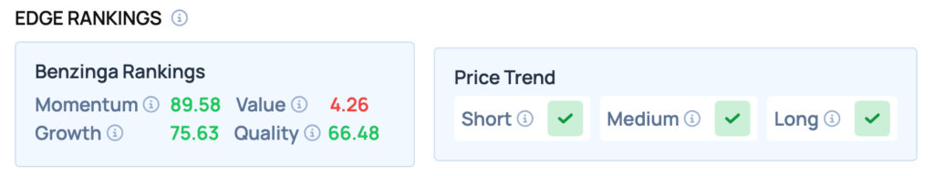 Tesla scores well on Momentum, Quality and Growth metrics, but offers poor Value. Tesla also offers a favorable price trend in the Short, Medium and Long term. For more such insights, sign up for Benzinga Edge Stock Rankings today!
