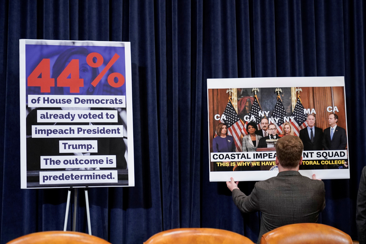 A House Judiciary Committee staff member removes Republican visual aids following House Judiciary Committee's markup of articles of impeachment against U.S. President Donald Trump, on Capitol Hill in Washington, U.S. December 11, 2019. Shawn Thew/Pool via REUTERS