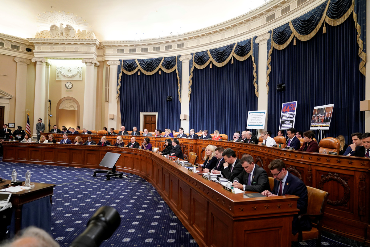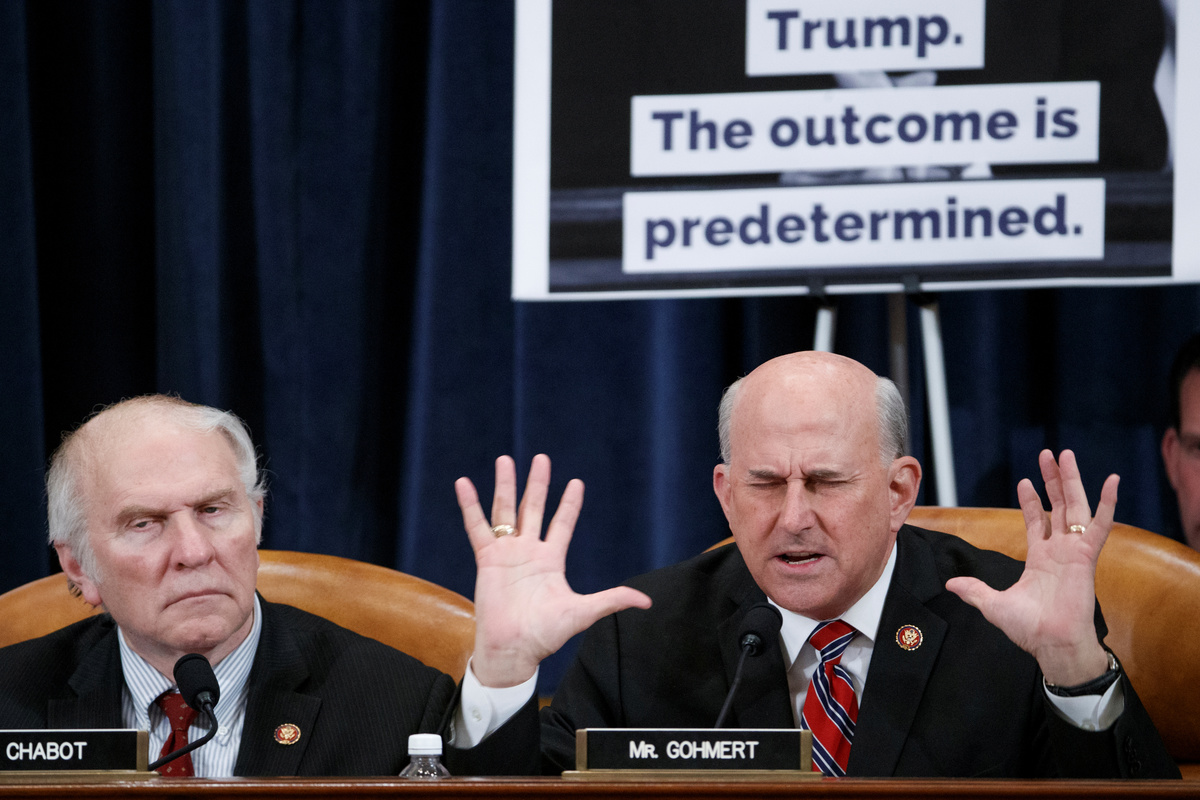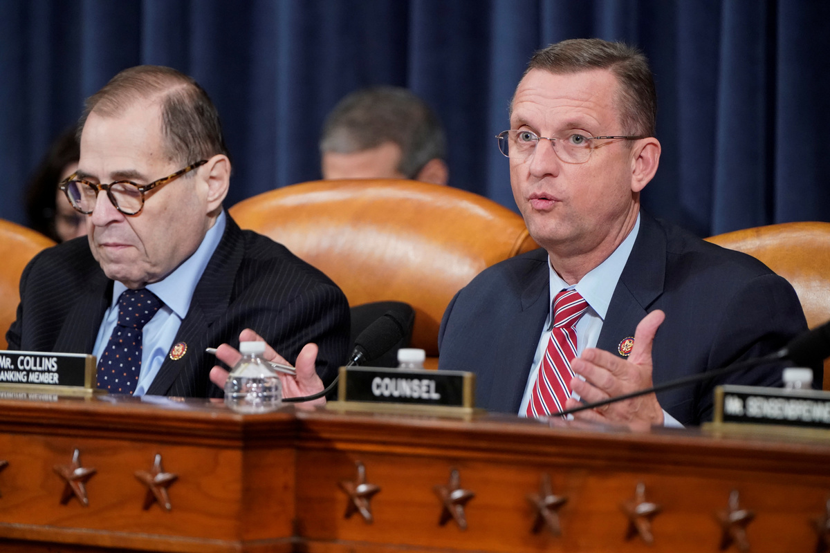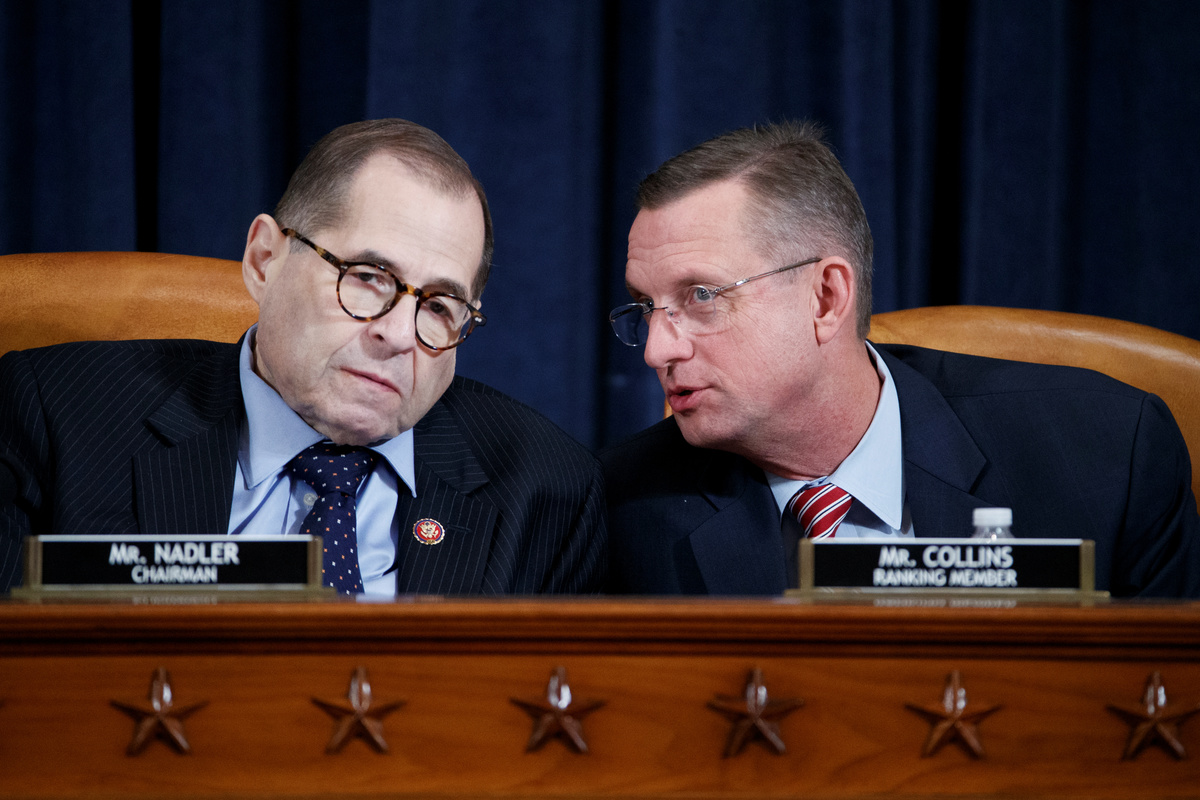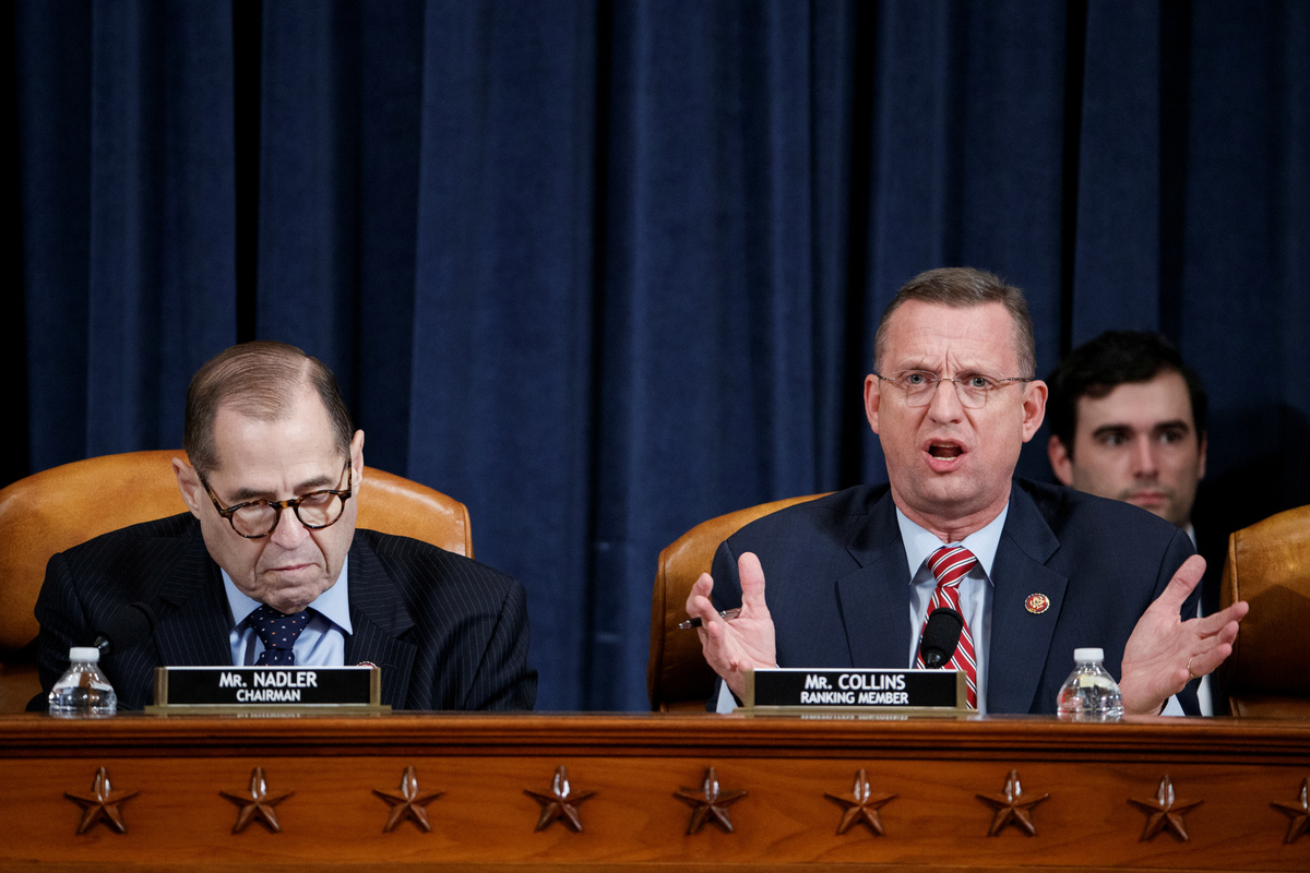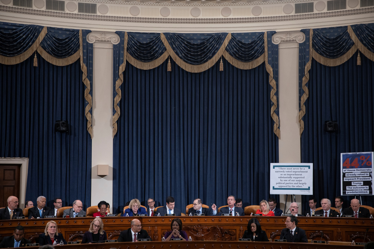 Rep. Sheila Jackson Lee, D-TX, speaks during a House Judiciary Committee markup of the articles of impeachment against President Donald Trump, on Capitol Hill in Washington December 11, 2019. Jose Luis Magana/Pool via REUTERSRepublican Representative from Texas Louie Gohmert (R) delivers remarks during the House Judiciary Committee's markup of articles of impeachment against U.S. President Donald Trump on Capitol Hill in Washington, U.S. December 11, 2019. Shawn Thew/Pool via REUTERSHouse Judiciary Committee Chairman Jerry Nadler (L) talks with House Judiciary Committee ranking member Doug Collins (R) during the House Judiciary Committee's markup of articles of impeachment against U.S. President Donald Trump on Capitol Hill in Washington, U.S. December 11, 2019. Shawn Thew/Pool via REUTERSRepublican Representative from Ohio Jim Jordan delivers remarks during the House Judiciary Committee's markup of articles of impeachment against U.S. President Donald Trump on Capitol Hill in Washington, U.S. December 11, 2019. Shawn Thew/Pool via REUTERSHouse Judiciary Committee ranking member Doug Collins (R), with House Judiciary Committee Chairman Jerry Nadler (L), delivers opening remarks during the House Judiciary Committee's markup of articles of impeachment against U.S. President Donald Trump on Capitol Hill in Washington, U.S. December 11, 2019. Shawn Thew/Pool via REUTERSRep. Pramila Jayapal (D-WA) holds a copy of the U.S. Constitution as she delivers an opening statement as the House Judiciary Committee begins its markup of articles of impeachment against U.S. President Donald Trump on Capitol Hill in Washington, U.S., December 11, 2019. REUTERS/Joshua RobertsRep. Jamie Raskin (D-MD) delivers an opening statement as the House Judiciary Committee begins its markup of articles of impeachment against U.S. President Donald Trump on Capitol Hill in Washington, U.S., December 11, 2019. REUTERS/Joshua RobertsA Republican staffer places placards before the House Judiciary Committee begins its markup of articles of impeachment against U.S. President Donald Trump on Capitol Hill in Washington, U.S., December 11, 2019. REUTERS/Joshua RobertsRep. Doug Collins (R-GA) delivers an opening statement as the House Judiciary Committee begins its markup of articles of impeachment against U.S. President Donald Trump on Capitol Hill in Washington, U.S., December 11, 2019. REUTERS/Joshua RobertsHouse Judiciary Committee member Sheila Jackson Lee delivers remarks during the House Judiciary Committee's markup of articles of impeachment against U.S. President Donald Trump on Capitol Hill in Washington, U.S. December 11, 2019. Shawn Thew/Pool via REUTERSHouse Judiciary Committee ranking member Doug Collins (R), with House Judiciary Committee Chairman Jerry Nadler (L), delivers opening remarks during the House Judiciary Committee's markup of articles of impeachment against U.S. President Donald Trump on Capitol Hill in Washington, U.S. December 11, 2019. Shawn Thew/Pool via REUTERSRep. Mark Meadows (R-NC) speaks with Rep. Matt Gaetz (R-FL) as the House Judiciary Committee begins its markup of articles of impeachment against U.S. President Donald Trump on Capitol Hill in Washington, U.S., December 11, 2019. REUTERS/Joshua RobertsThe House Judiciary Committee begins its markup of articles of impeachment against U.S. President Donald Trump on Capitol Hill in Washington, U.S., December 11, 2019. REUTERS/Joshua RobertsFILE PHOTO: U.S. President Donald Trump delivers remarks during a campaign rally at the Giant Center in Hershey, Pennsylvania, U.S., December 10, 2019. REUTERS/Tom Brenner