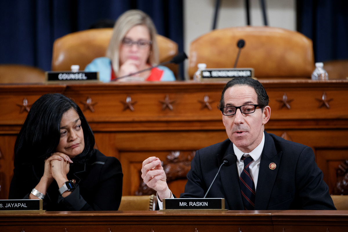 Democratic Representative from Maryland Jamie Raskin (R), with Democratic Representative from Washington Pramila Jayapal (L), delivers remarks during the House Judiciary Committee's markup of articles of impeachment against U.S. President Donald Trump on Capitol Hill in Washington, U.S. December 11, 2019. Shawn Thew/Pool via REUTERS